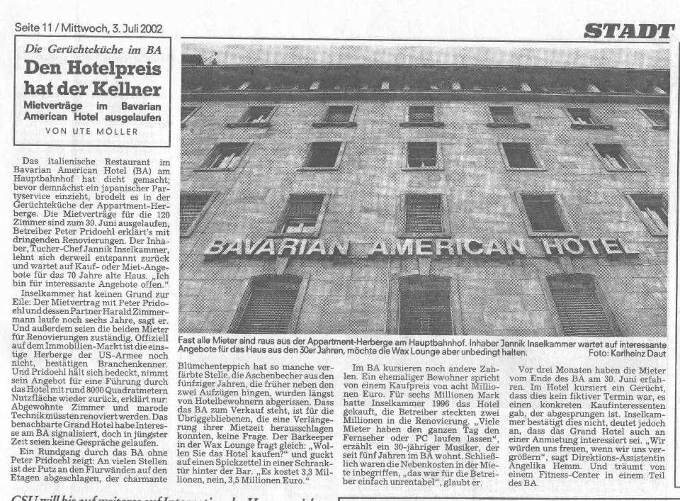 July 2002: Troubles with the BA Hotel: It needs to be renovated for the appartments have been worn down by the roomers, but there seems to be no money for that. Maybe it will be sold. Do you have 3.3 Mio Euro? |