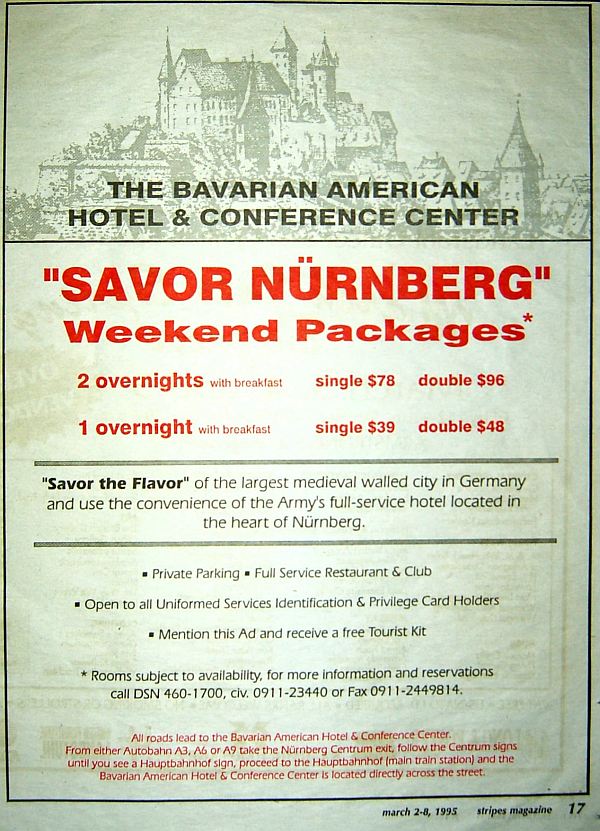 | Impressions of the BA Hotel at the former opening of the "Szene Gastro" - long closed now. Thank you, Jürgen Mach. | ![]() | Above: Advertisement from "Stars & Stripes", March 2-8 1995 | |