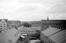 | Just recently I received a lot of photos from Fuerth in 1945. They were taken by Jerry Pinkowski and discovered by his grandson, Scott Pinkowski. Thank you very much, Scott. More about Jerry Pinkowski's photos you'll find on this very Interesting homepage. | ![]() View to the west towards Steubenstraße. Most of the photos presumably were taken from an early radio tower. | ![]() View towards the south. The clock tower on the right is on top of the later library. | ![]() The later Hardenberg Gymnasium is in the back. |