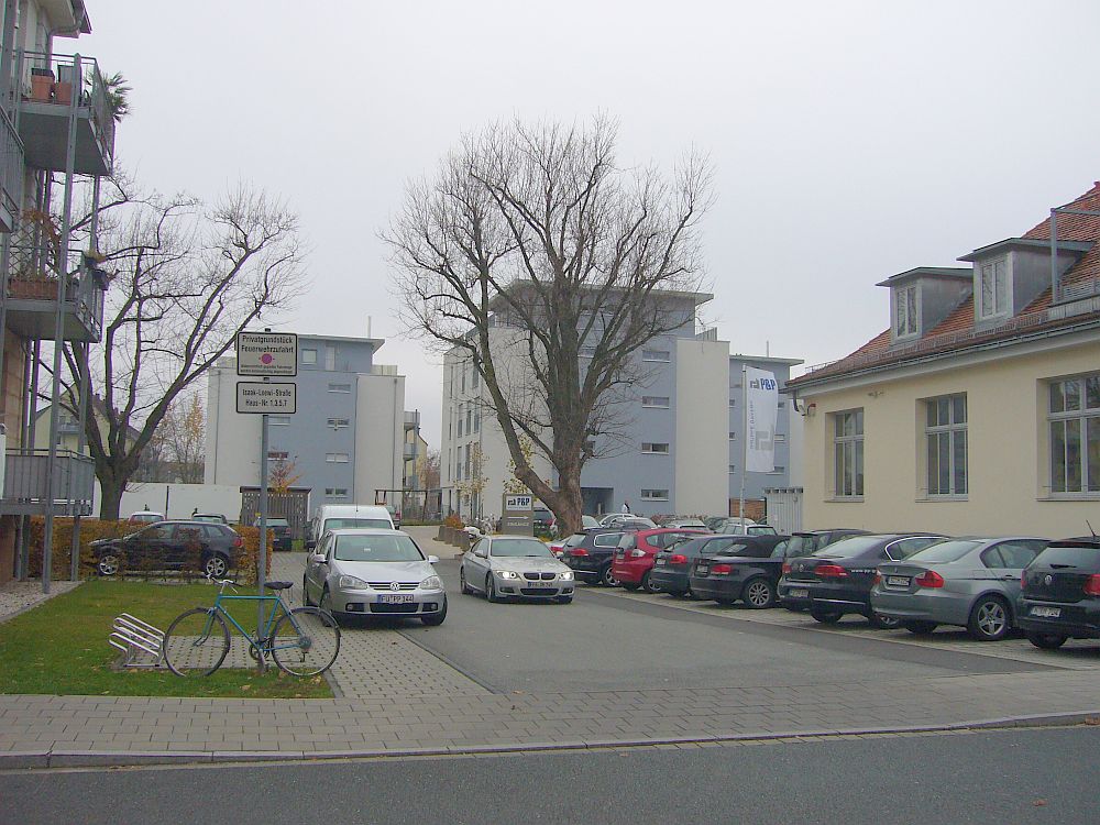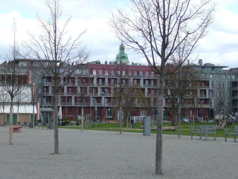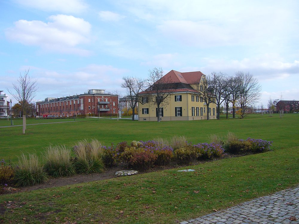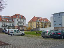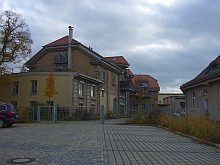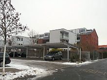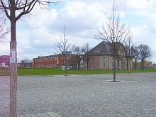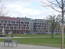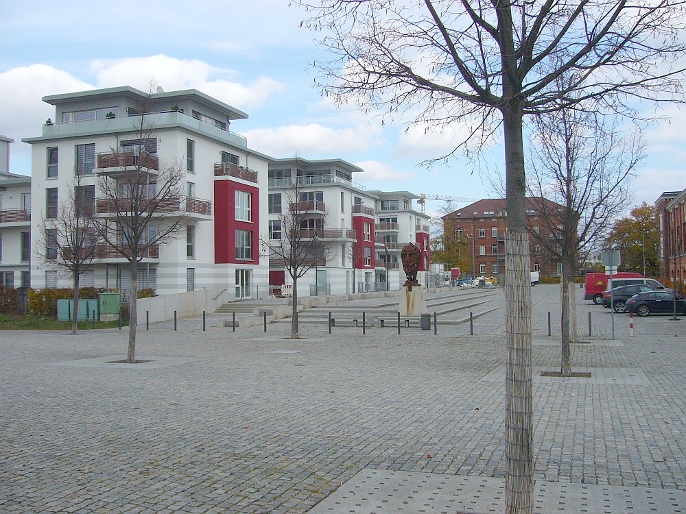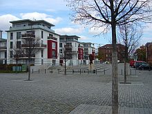 ![]() View to Steubenstraße, on the parade ground. | ![]() The former library, now office of the property developer P&P. | ![]() Bld. 1 has balconies now. | ![]() Bld. 1 in the back left. |