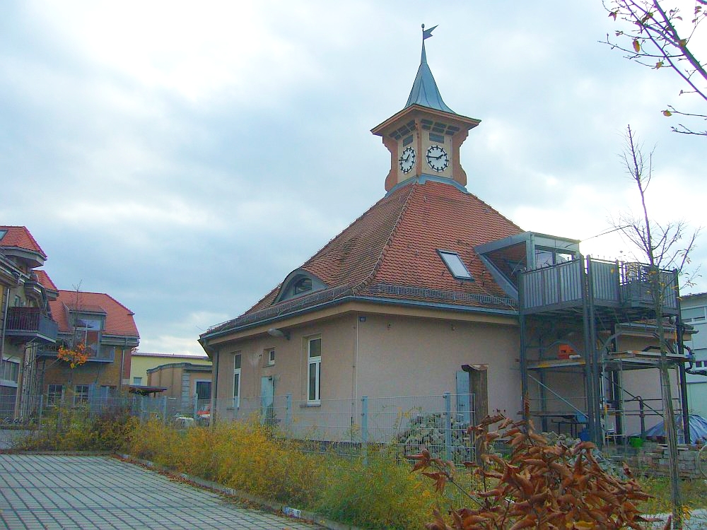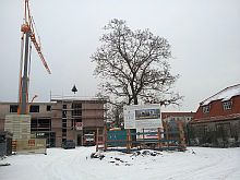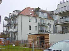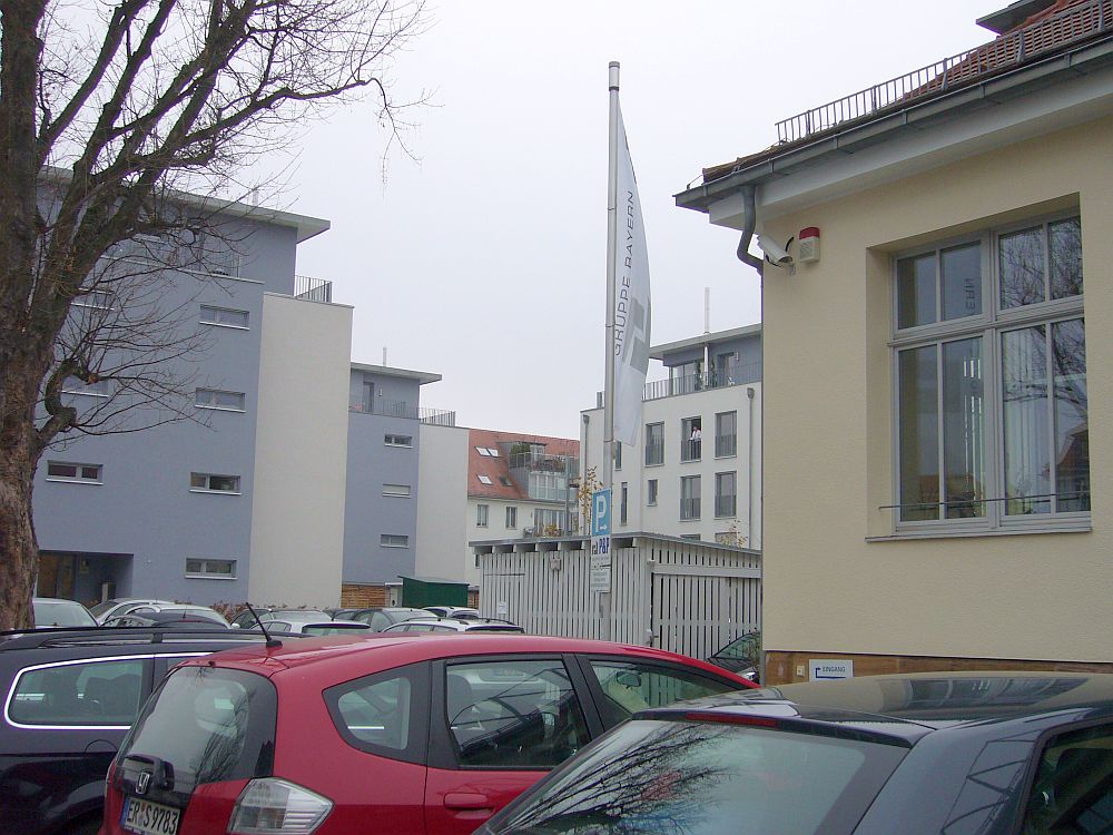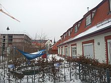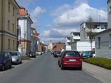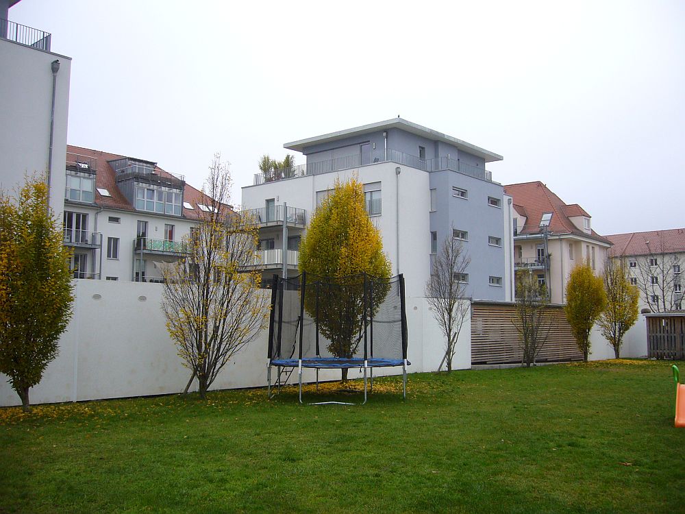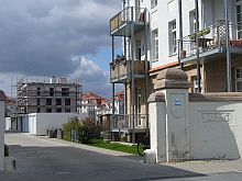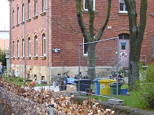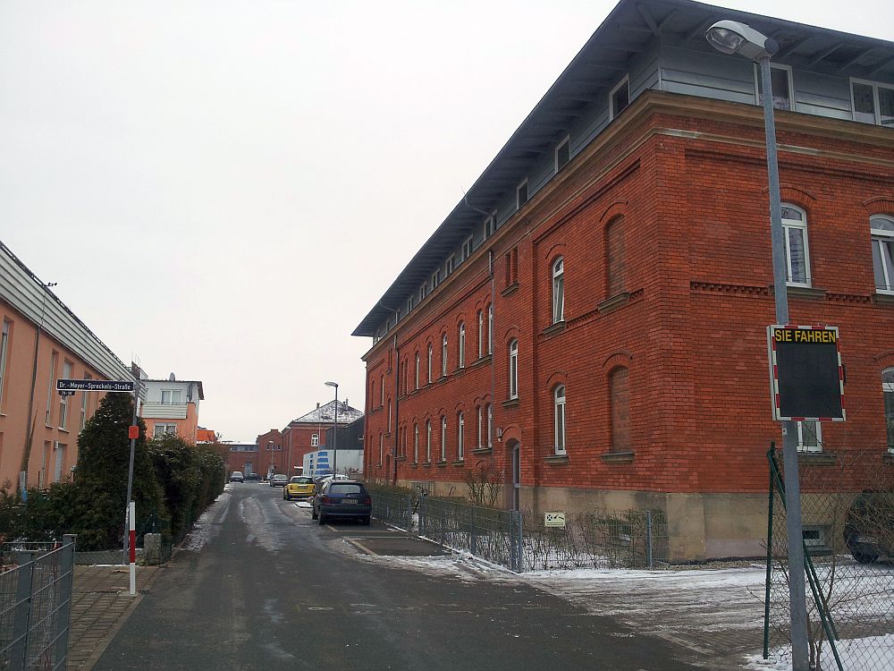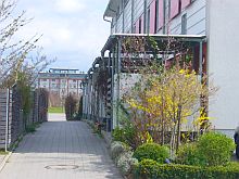 ![]() View to Steubenstraße, on the parade ground. | ![]() The former library, now office of the property developer P&P. | ![]() Bld. 1 has balconies now. | ![]() Bld. 1 in the back left. |