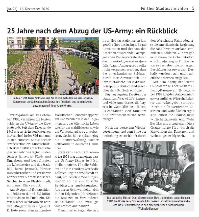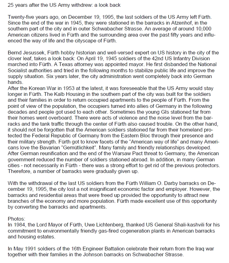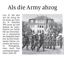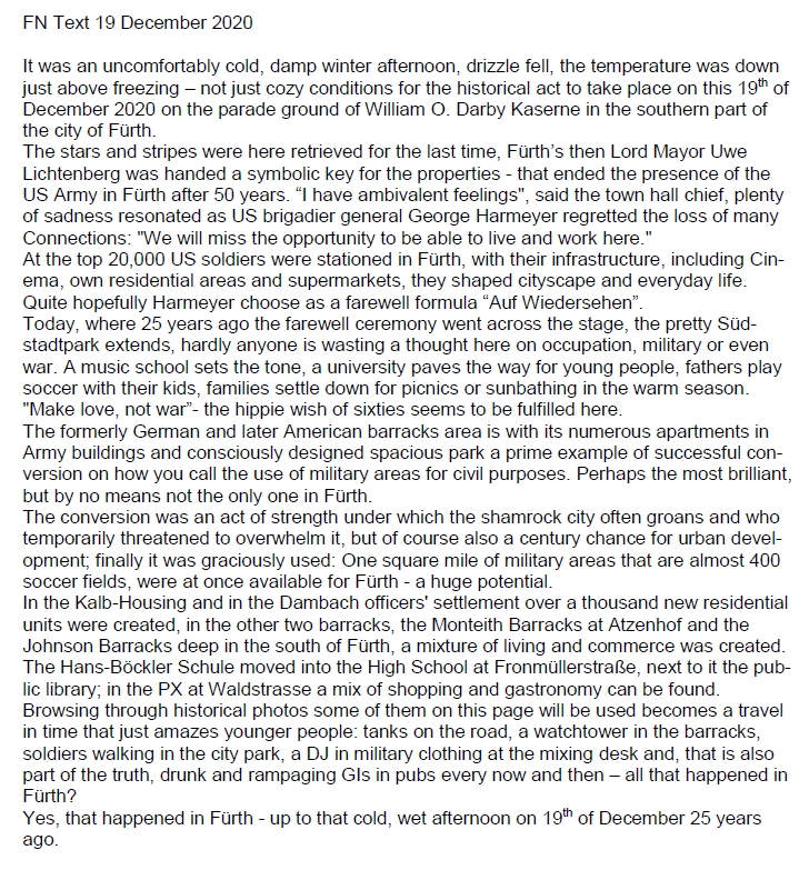 19 December 2020: 25 years after the drawdown and the final closure of Darby Kaserne | ![]() You should imagine about 20 people - former members of the German-American Men's Club - would have been gathering here today in front of the commemorative plaque at Darby Kaserne. Because of the pandemic situation and the lockdown we could neither assemble there nor celebrate a dine-out afterwards. | ![]() On the 16th of December an article appeared in the Fürth "Stadtzeitung" (translation by Google/Jesussek). | ![]() On the 19th of December an article appeared in the "Fürther Nachrichten" (translation by Google/Jesussek). |