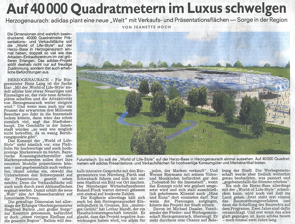 May 2006). The "World of Life-Style" shall become a display for quality and luxury brands. The lory mayor of Erlangen instead isn't very responsive because of possibly loosing customers there. The opening will not be before 2010. |