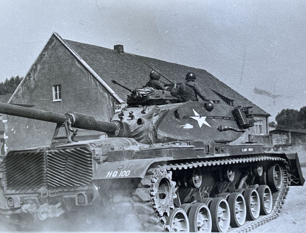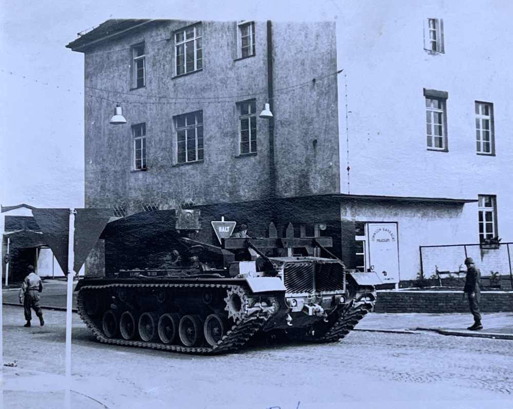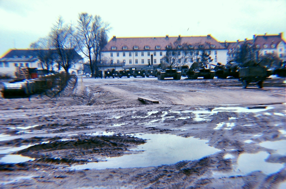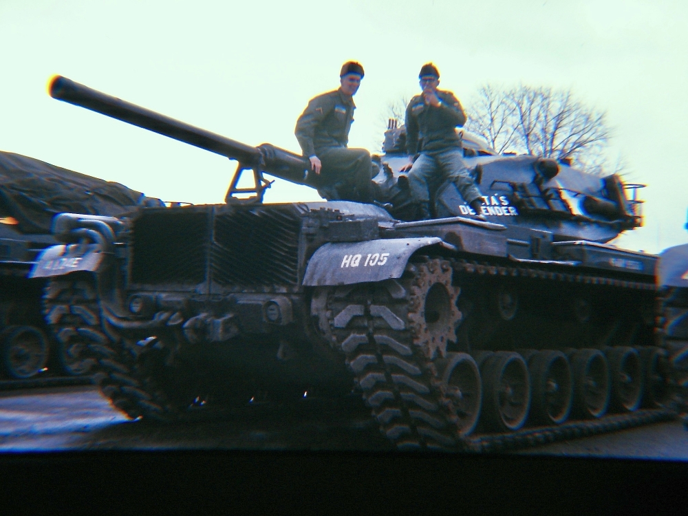![]() HQ company mess hall. It must have been a holiday as I am in civilian clothes and a cake is being served. | ![]() Soldiers HQ co 24th Engineers waiting in chow line. | ![]() For some reason these 24th Engineer tanks were driving through the warehouses area and I happen to be there with my camera. | ![]() M60 AVLB (Armored Vehicle Launch Bridge) entering the front gate. This AVLB normally would have a scissor folding bridge on top of it. But apparently the bridge had been deposited somewhere. The soldier walking in front of it is known as a “ground guide” to guide the vehicle and prevent accidents in confined spaces. As I recall the battalion had only a few of these vehicles, 2 maybe. |