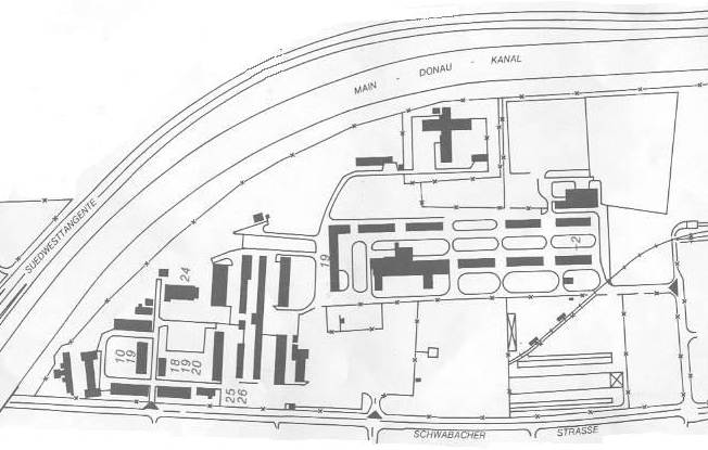 17 August 2003: At the bottom right the Main-Danube-Canal crosses the outer Schwabacher Strasse. The big white square in the upper left is the filling station of the Tucher brewery. A miles-long pipeline from the downtown brewery at Schwabacher Straße ends here. Next to the smaller white square below is the last reminding warehouse. |