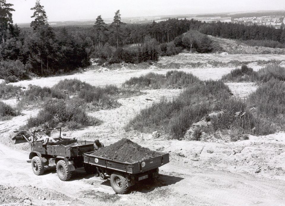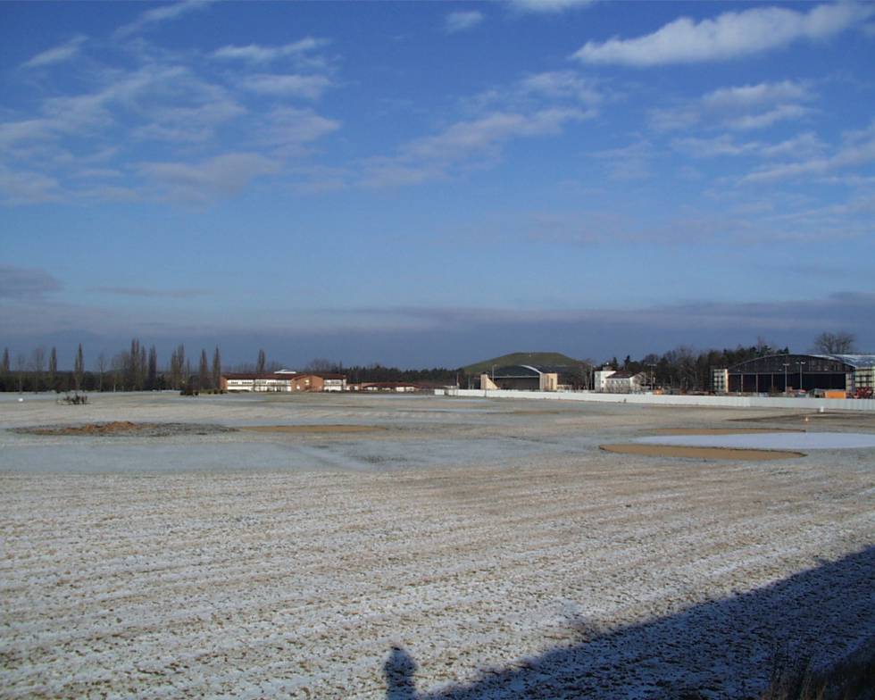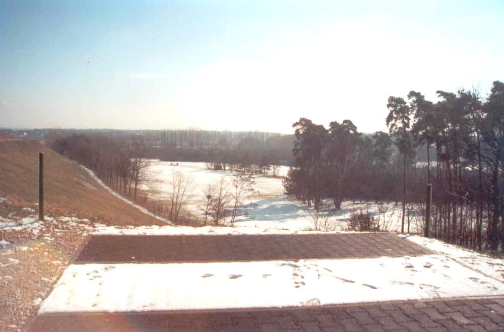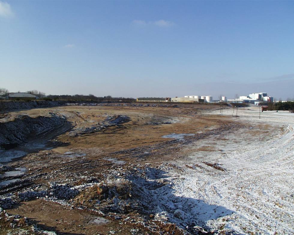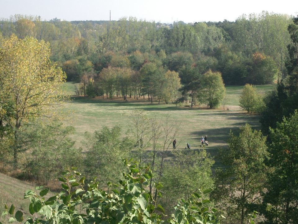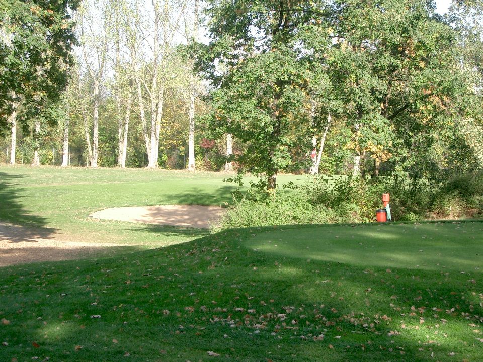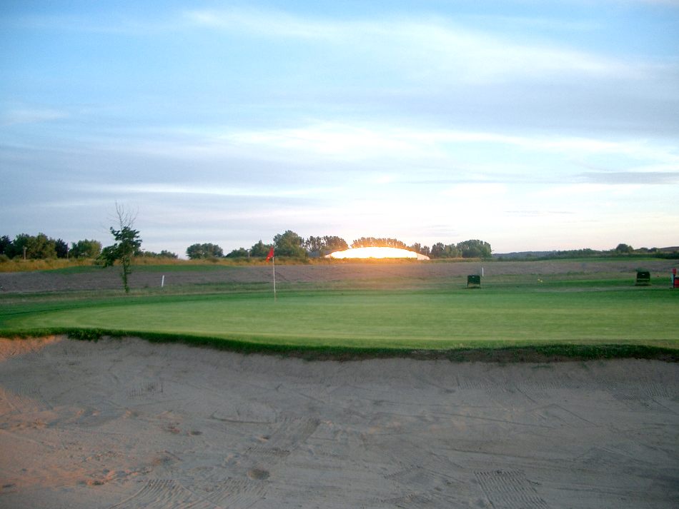 The chipping ground (former picnic area) with the sand bunker in the front and the driving range in the back. |