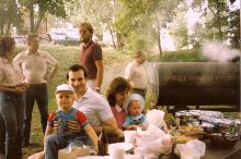 Left: Doug Batson sent me this picture and wrote: "Bernd, I have an ideal companion photo for the picnic area at Monteith Barracks. Attached is a 1986 Organization Day Picnic photo from that same location. The tall, thin, bearded man behind me is Chuck Walker, Education Services Specialist. I was the Guidance Counselor, both of us were employed at the Monteith Barracks Army Education Center. The two little boys are my sons, Kevin and Benjamin Batson (der kleinste), who, you can write both still live in Fuerth." |