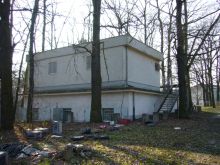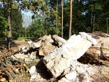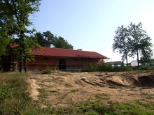 Left: The former Picnic area (in front). The building for the new locker rooms of the golf club is placed on the former tennis court. Right: The reminders of the picnic area are stored in the back of the garage building that is now used for the golf club machines. |