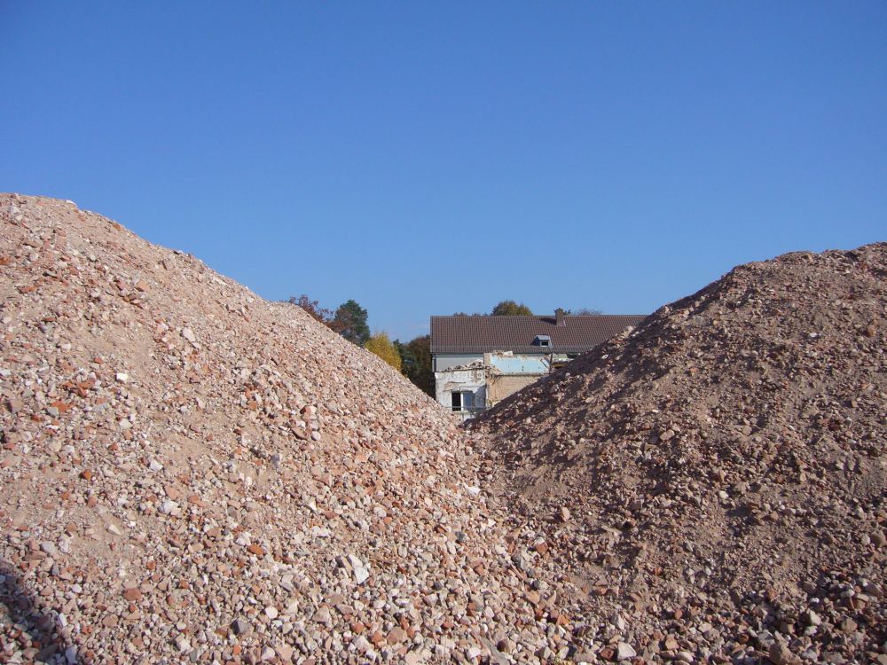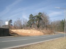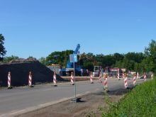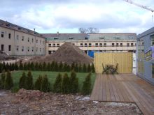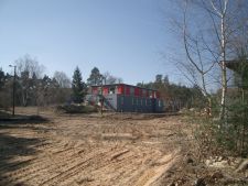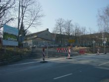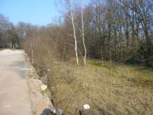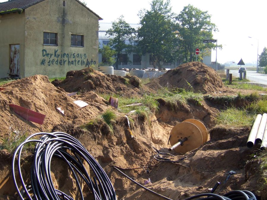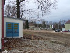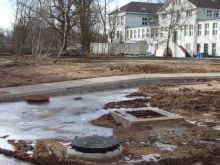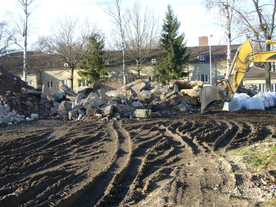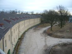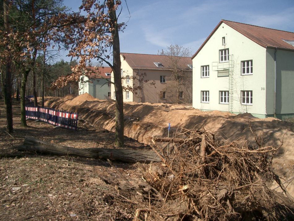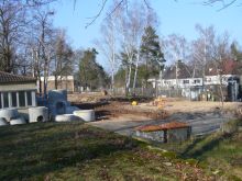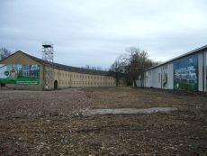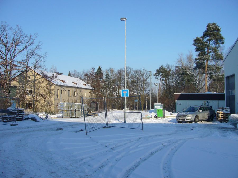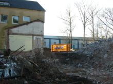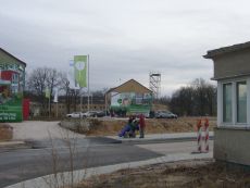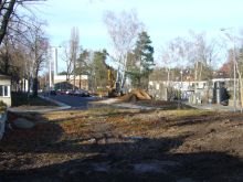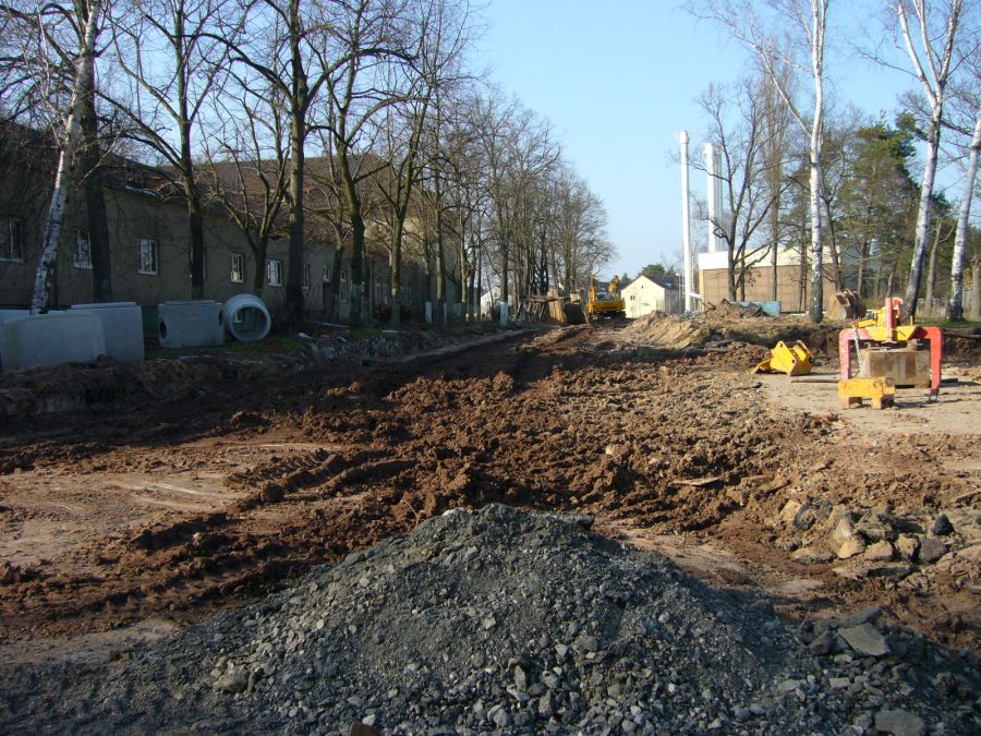 All pictures from 18 February 2007: Left: The building 295 at the former main gate has been removed completely - and with it the washed-out letters "Monteith Barracks". Right: The road that turned right after the main gate. The sewage system is completely renewed. |
