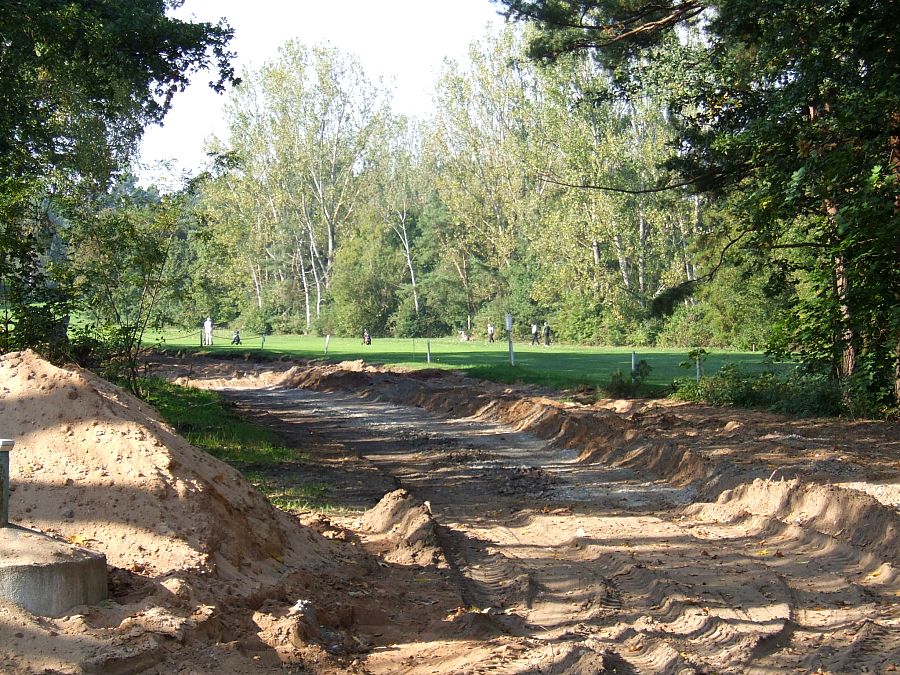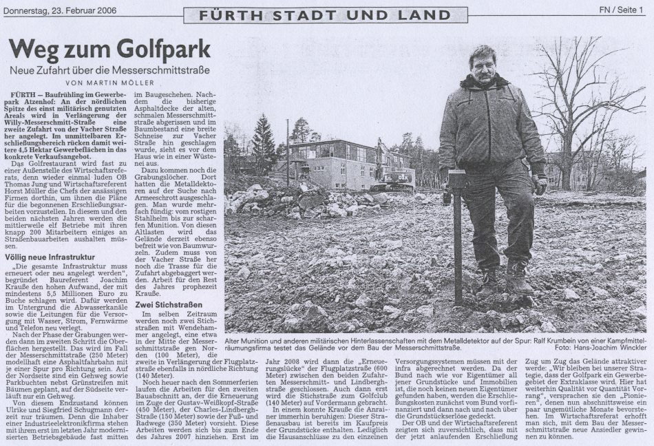 of the "Golfpark" with more than 5.5 Million Euro. A second entrance gate will be opend along Vacher Straße (alongside fairway 8). The supply lines (water, Sewage, natural gas) will be upgraded, street surfaces will be renewed and sidewalks will be added. With metal detectors "Army scrap" is identified and then removed (from steel helmets to ammunition). See "Fürther Nachrichten" from 23 February 2006. |