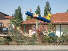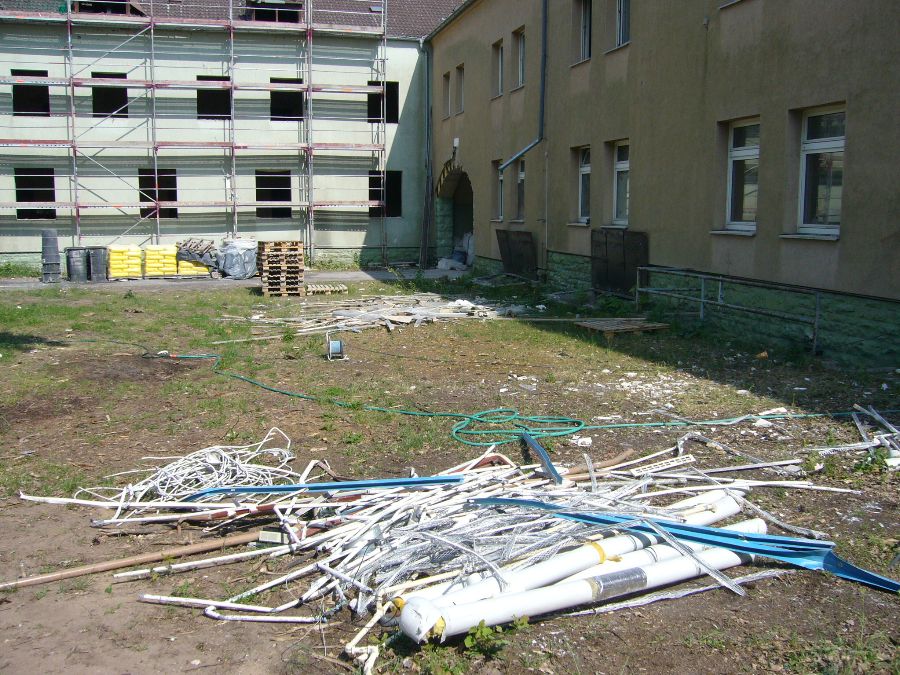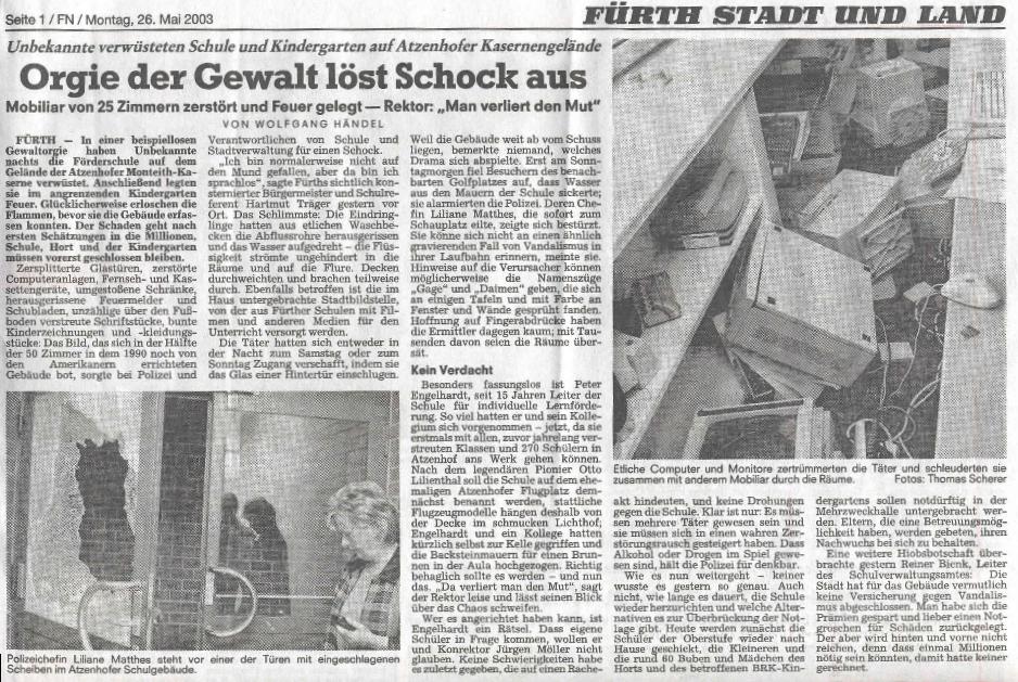Nachrichten" from 26 May 2003): Two students broke into the school during the weekend and caused damage estimated to millions of Euro. They devastated 25 classrooms by opening the water pipes, destroyed the computers, windows etc.The damage was discovered on Sunday morning when golf players saw water floods coming out of the walls! The students set fire to the Kindergarten as well but this got out by itself. - Three days later the police seized two 14 and 17 year old students from this school who confessed their action. |