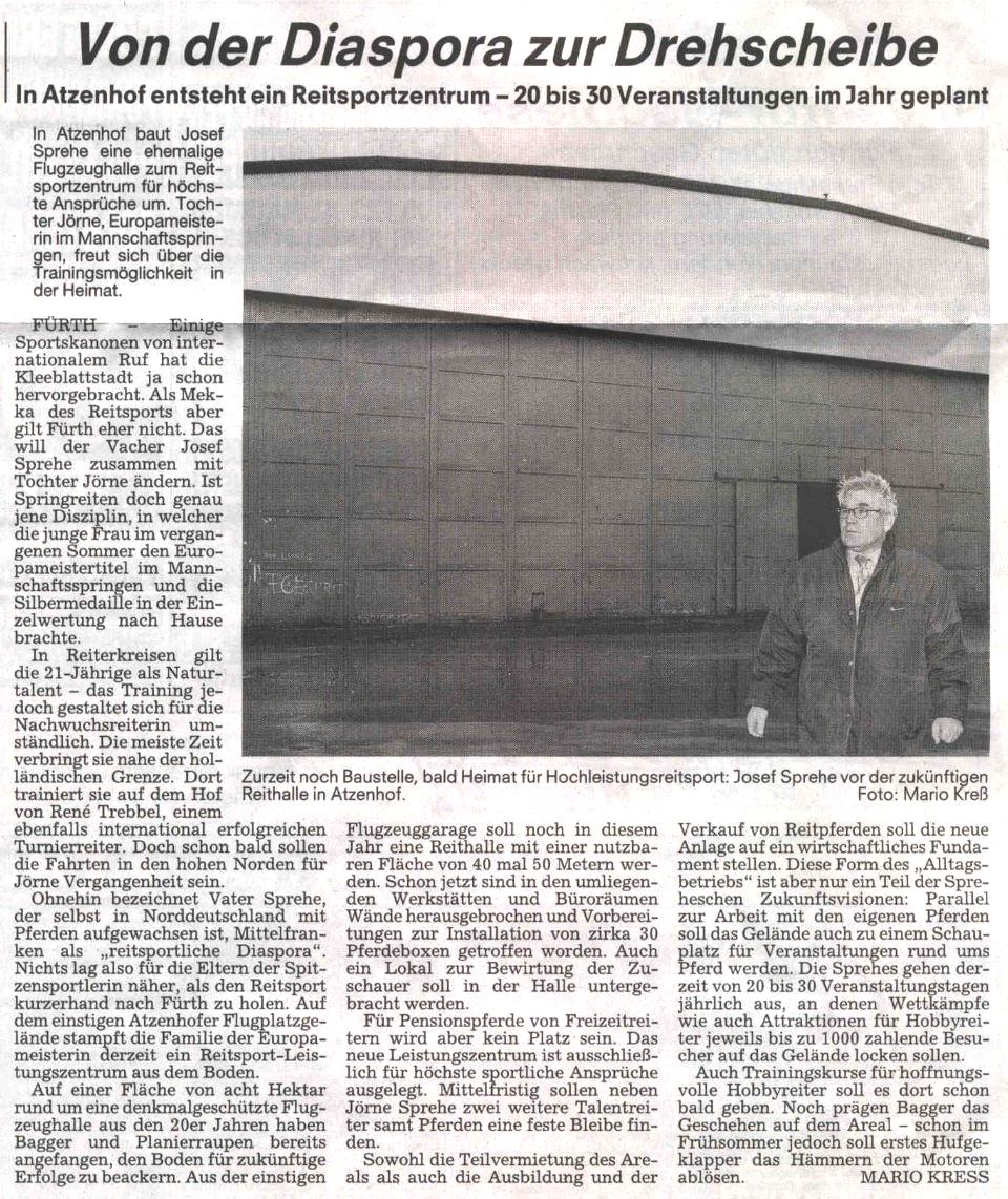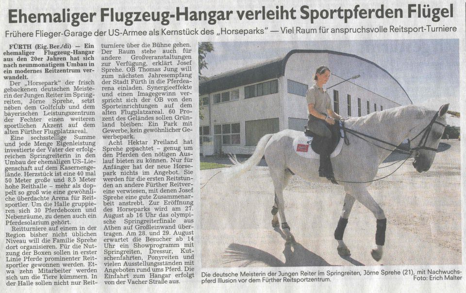 A riding school shall be established in one of the hangars (the one close to the Farrnbach valley in the South) with approx. 30 horse boxes. (Fuerther Nachrichten from 22 January 2004). The "horsepark" will be opened end of August 2004 (Fuerther Nachrichten from 20 August 2004). |