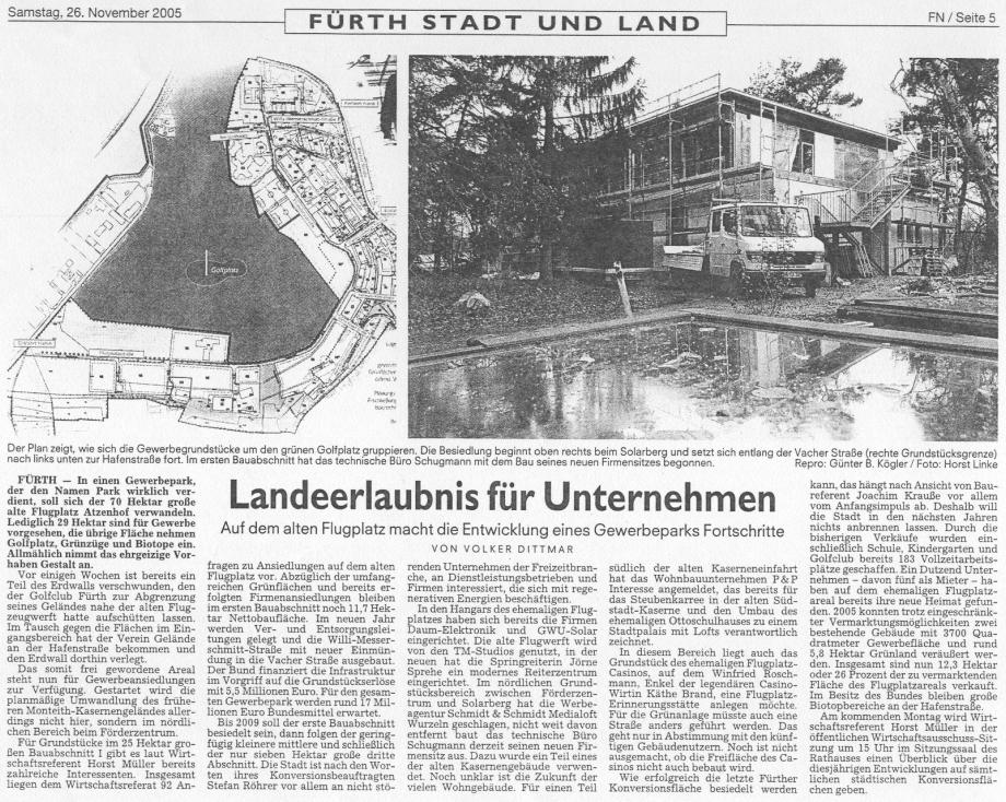 The name "Golfpark" is more and more common for the area of the former Monteith Barracks. | The industrial area at Monteith is displayed. An article from the "Fuerther Nachrichten" (26 November 2005). | ||