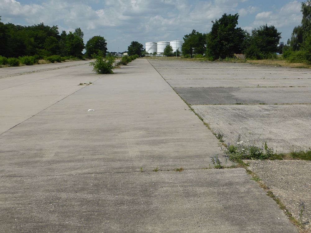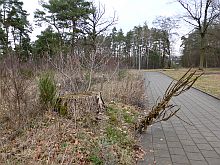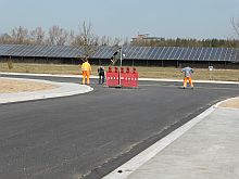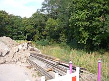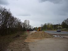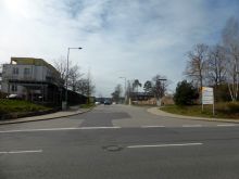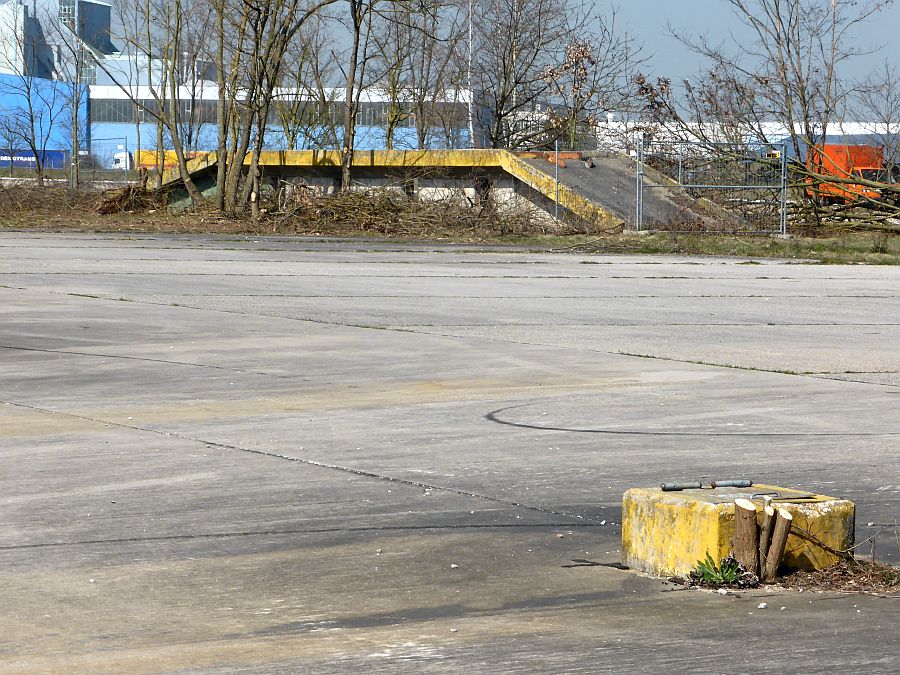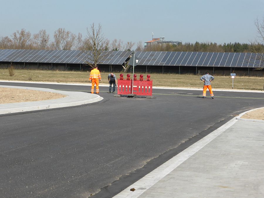 ![]() One of the last remainders of the US Army, a ramp for tank repair. | ![]() New roads for more business. Solar panels along fairway No. 16 in the back. | Photos from 3 April 2015. The improvement of the infrastructure at Monteith. | ![]() The exit to Hafenstraße is paved new. |
