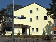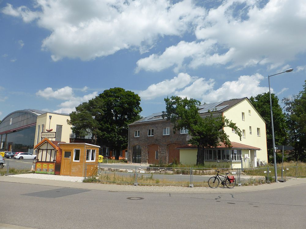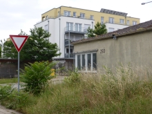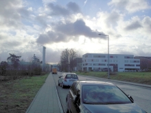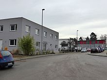 ![]() The Flugplatzstraße with the former bowling alley (right) and the fire station (left). | ![]() The former fire station is renovated. | ![]() Opposite view as above. | ![]() The entrance of the Fraunhofer Institute. |