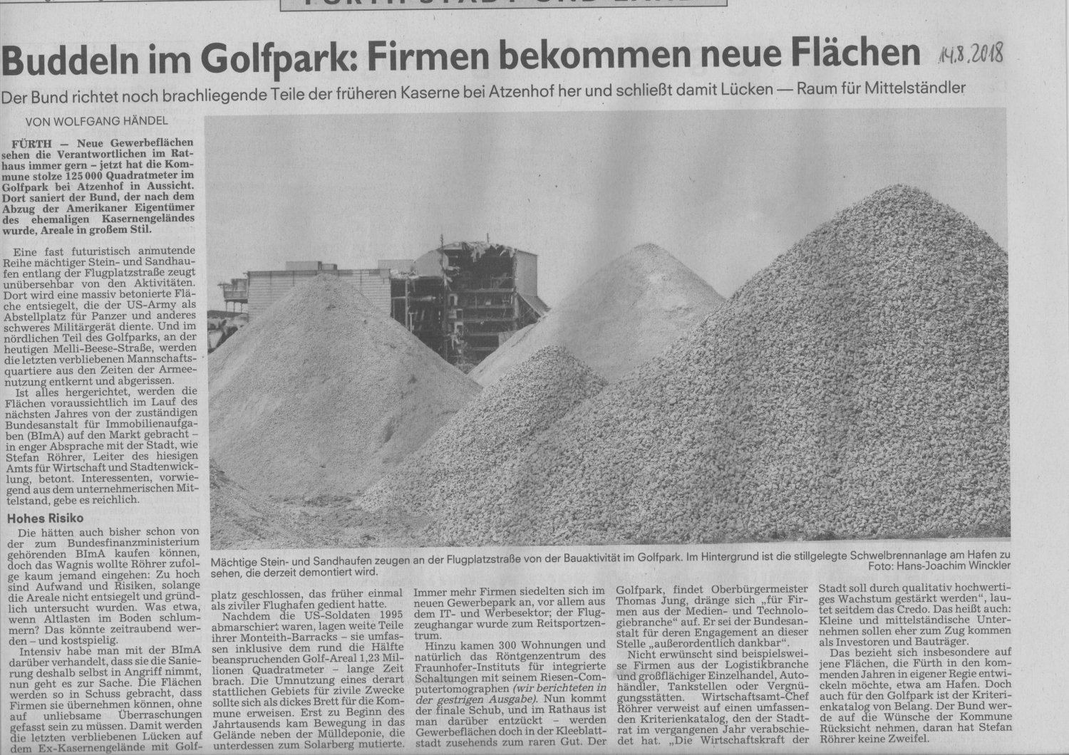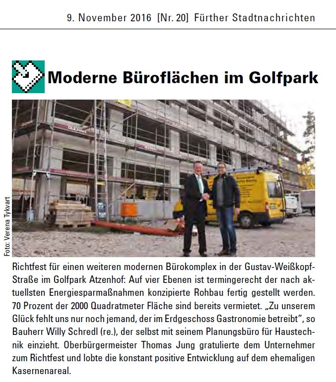 A new office building is under construction. (9 November 2016) | It will consist of 22,000 square feet on 4 floors at the Gustav-Weißkopf-Straße. | ![]() | The "Golfpark" (former Monteith Barracks) is continuously filled with new companies. |