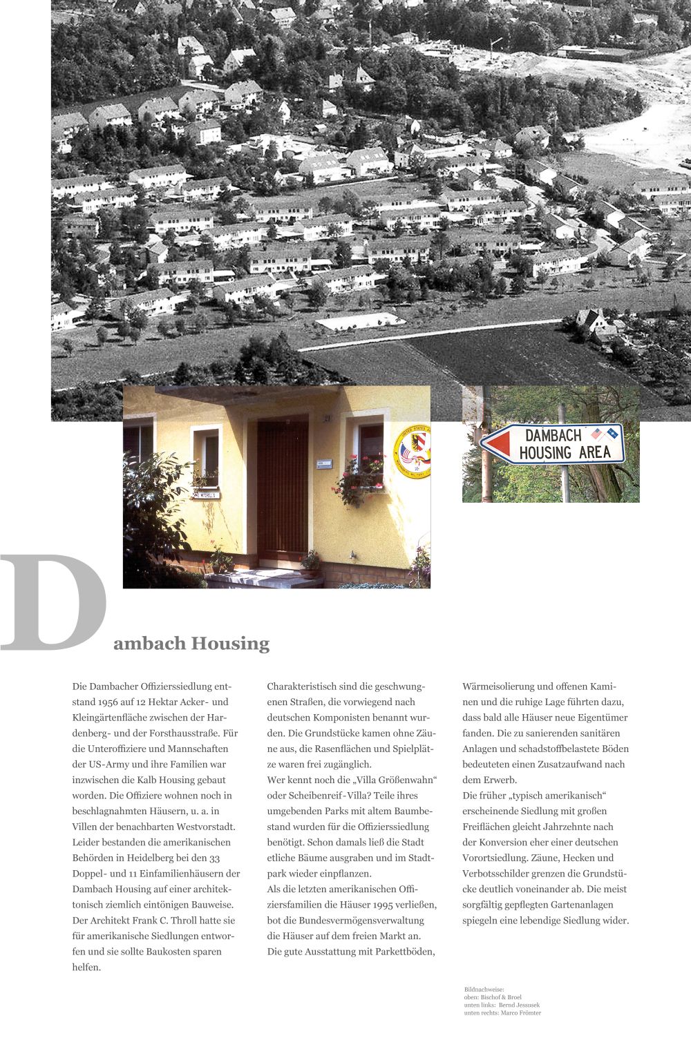 The Dambach officers' settlement was built in 1956 on 12 hectares of arable and allotment gardens between Hardenbergstrasse and Forsthausstrasse. In the meantime, the Kalb Housing had been built for the NCOs and men of the US Army and their families. The officers still live in confiscated houses, among other things in villas in the neighboring western suburb. Unfortunately, the American authorities in Heidelberg insisted on an architecturally rather monotonous construction method for the 33 double and 11 single-family houses of Dambach Housing. It was designed by the architect Frank C. Throll for American settlements and it should help save construction costs. The curved streets, which are mainly named after German composers, are characteristic. The plots managed without fences, the lawns and playgrounds were freely accessible. Who still knows the “Villa Größenwahn" (megalomania) or Scheibenreif villa? Parts of their surrounding park with old trees were needed for the officers' settlement. Even then, the city had a number of trees dug up and replanted in the city park. When the last American officer's families left the houses in 1995, the federal property administration put the houses on the open market. The good equipment with parquet floors, thermal insulation and open chimneys and the quiet location meant that soon all houses found new owners. The sanitary facilities to be renovated and the polluted floors meant additional expenditure after the purchase. Decades after the conversion, the settlement, which used to appear “typically American” with large open spaces, looks more like a German suburb. Fences, hedges and prohibition signs clearly demarcate the properties from each other. The mostly carefully tended gardens reflect a lively settlement. |
