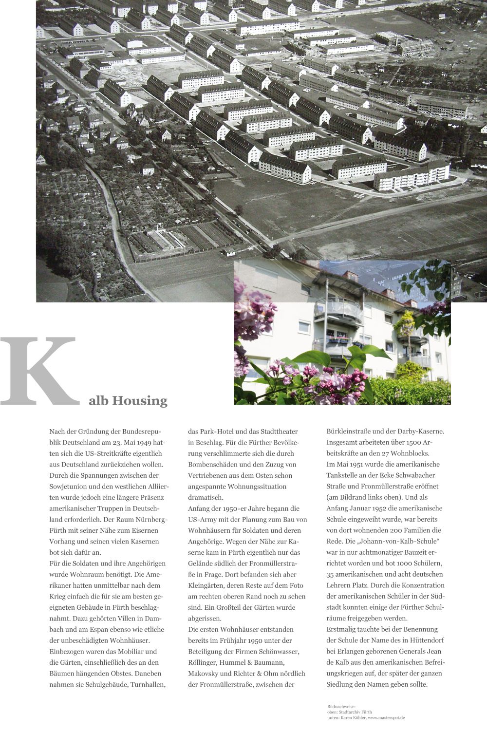 After the founding of the Federal Republic of Germany on May 23, 1949, the US armed forces actually wanted to withdraw from Germany. However, the tensions between the Soviet Union and the Western Allies required a longer presence of American troops in Germany. The Nuremberg-Fuerth area with its proximity to the Iron Curtain and its many barracks offered itself. Housing was required for the soldiers and their relatives. Immediately after the war, the Americans simply confiscated the most suitable buildings in Fuerth. This included villas in Dambach and on Espan as well as many of the undamaged residential buildings. The furniture and gardens, including the fruit hanging on the trees, were included. In addition, they seized school buildings, gyms, the Park Hotel and the city theater. For the population of Fuerth, the housing situation, which was already tense due to bomb damage and the influx of displaced persons from the east, worsened dramatically. In the early 1950s, the US Army began planning the construction of homes for soldiers and their families. Because of its proximity to the barracks, only the area south of Fronmüllerstrasse was actually considered in Fuerth. But there were allotments there, the remains of which can still be seen in the photo at the top right. Much of the gardens were demolished. The first residential buildings were built in the spring of 1950 with the participation of Schönwasser, Röllinger, Hummel & Baumann, Makovsky and Richter & Ohm north of Fronmüllerstrasse, between Bürkleinstrasse and Darby Kaserne. A total of over 1500 workers worked on the 27 apartment blocks. In May 1951 the American gas station was opened on the corner of Schwabacher Strasse and Fronmüllerstrasse (top left of the picture). And when the American school was inaugurated at the beginning of January 1952, already 200 families were living there. The "Johann von Kalb School" was built in just eight months and offered space for 1,000 students with 35 American and eight German teachers. Due to the concentration of American students in the southern part of the city, some of the occupied Fuerth classrooms could be released. When the school was named, the name of General Jean de Kalb from the American Wars of Liberation, who was born in Hüttendorf near Erlangen, appeared for the first time. Later the whole settlement was named after him. |