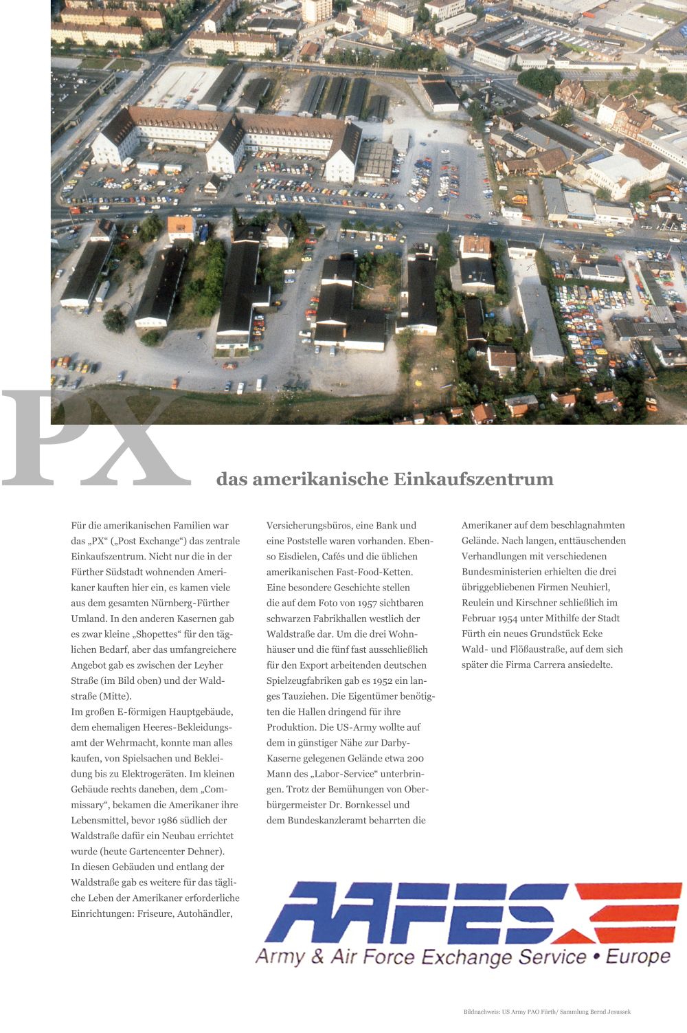 For American families, the “PX” (“Post Exchange”) was the central shopping center. Not only did the Americans living in the south of Fürth shop here, many came from all over Nuremberg-Fürth. In the other barracks there were small “shopettes” for daily needs, but the more extensive range was between Leyher Strasse (in the picture above) and Waldstraße (center). In the large E-shaped main building, the former Army Clothing Office of the Wehrmacht, you could buy everything from toys and clothing to electrical appliances. The Americans got their groceries in the small building to the right, the “Commissary”, before a new building was erected south of Waldstrasse in 1986 (today the Dehner Garden Center). In these buildings and along Waldstrasse there were other facilities necessary for the daily life of the Americans: hairdressers, car dealers, insurance offices, a bank and a post office. Likewise, ice cream parlors, cafes and the usual American fast food chains. The black factory halls to the west of Waldstrasse, visible in the photo from 1957, represent a special story. In 1952 there was a long tug-of-war around the three residential buildings and the five German toy factories, which work almost exclusively for export. The owners urgently needed the halls for their production. The US Army wanted to accommodate around 200 “Labor Service” men on the site conveniently located near the Darby barracks. Despite the efforts of Lord Mayor Dr. Bornkessel and the Federal Chancellery, the Americans insisted on the confiscated site. After long, disappointing negotiations with various federal ministries, the three remaining companies Neuhierl, Reulein and Kirschner finally received a new plot of land on the corner of Waldstrasse and Flößaustrasse in February 1954 with the help of the city of Fürth, where later the Carrera toy company settled down. |