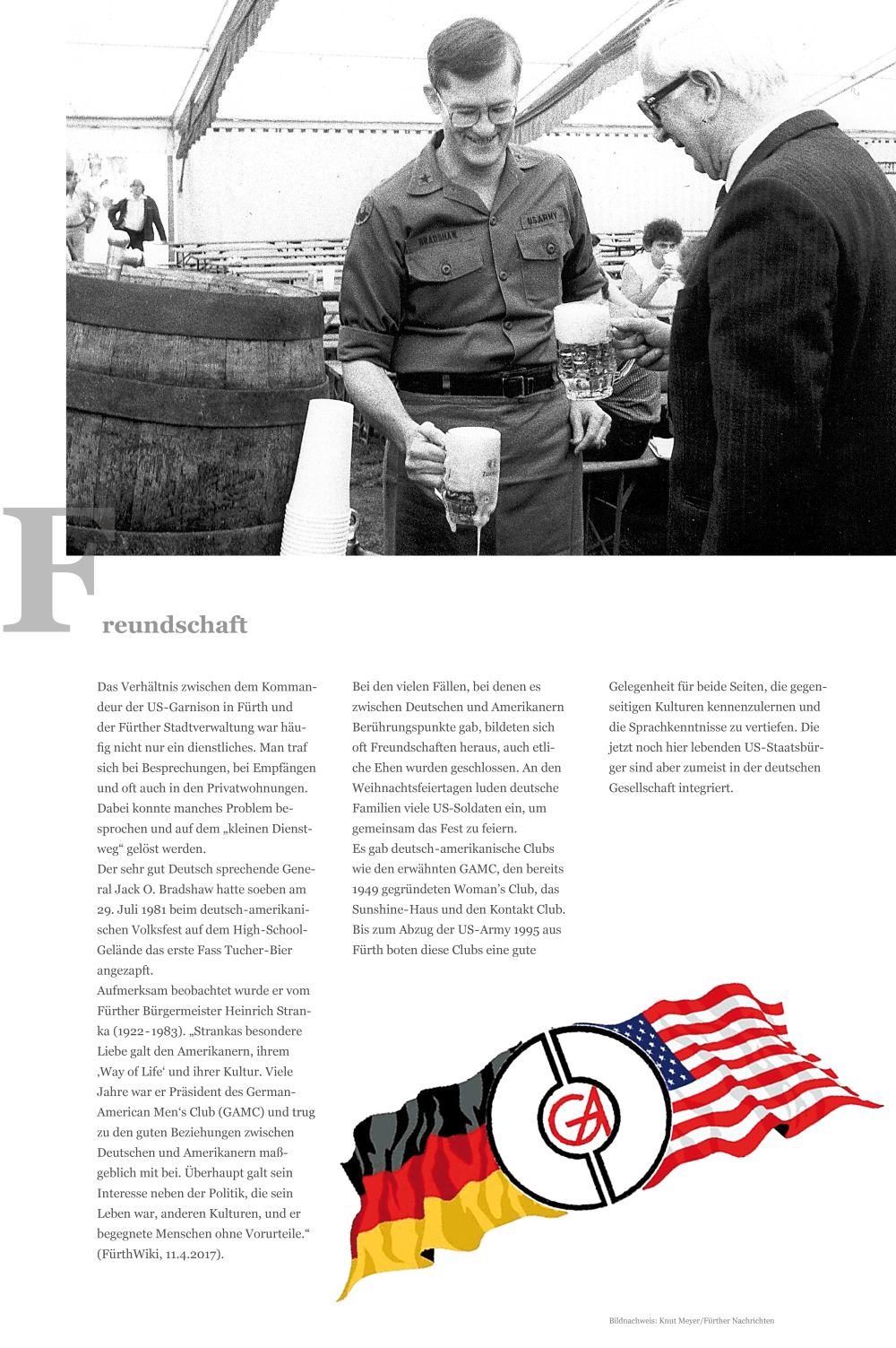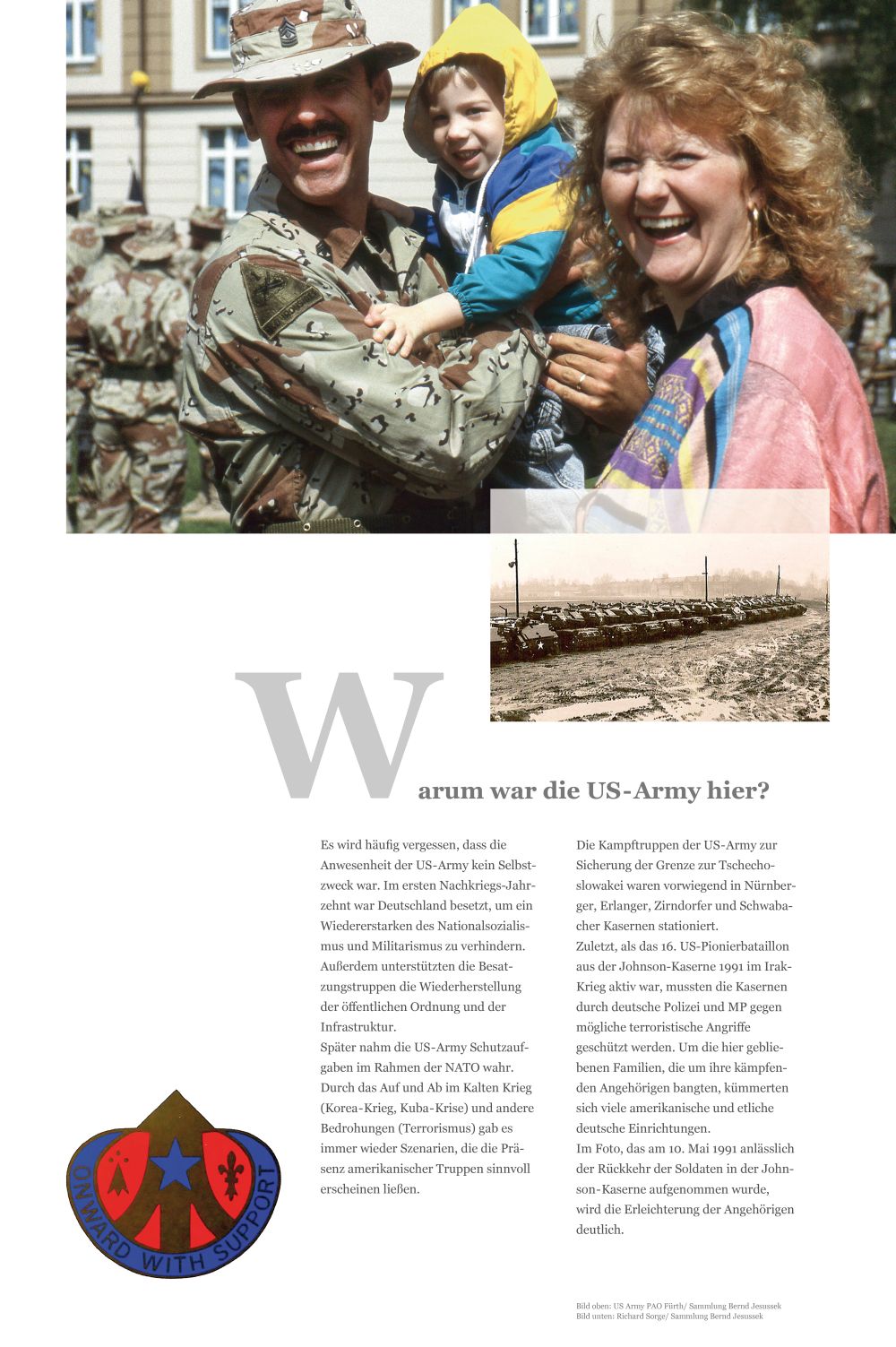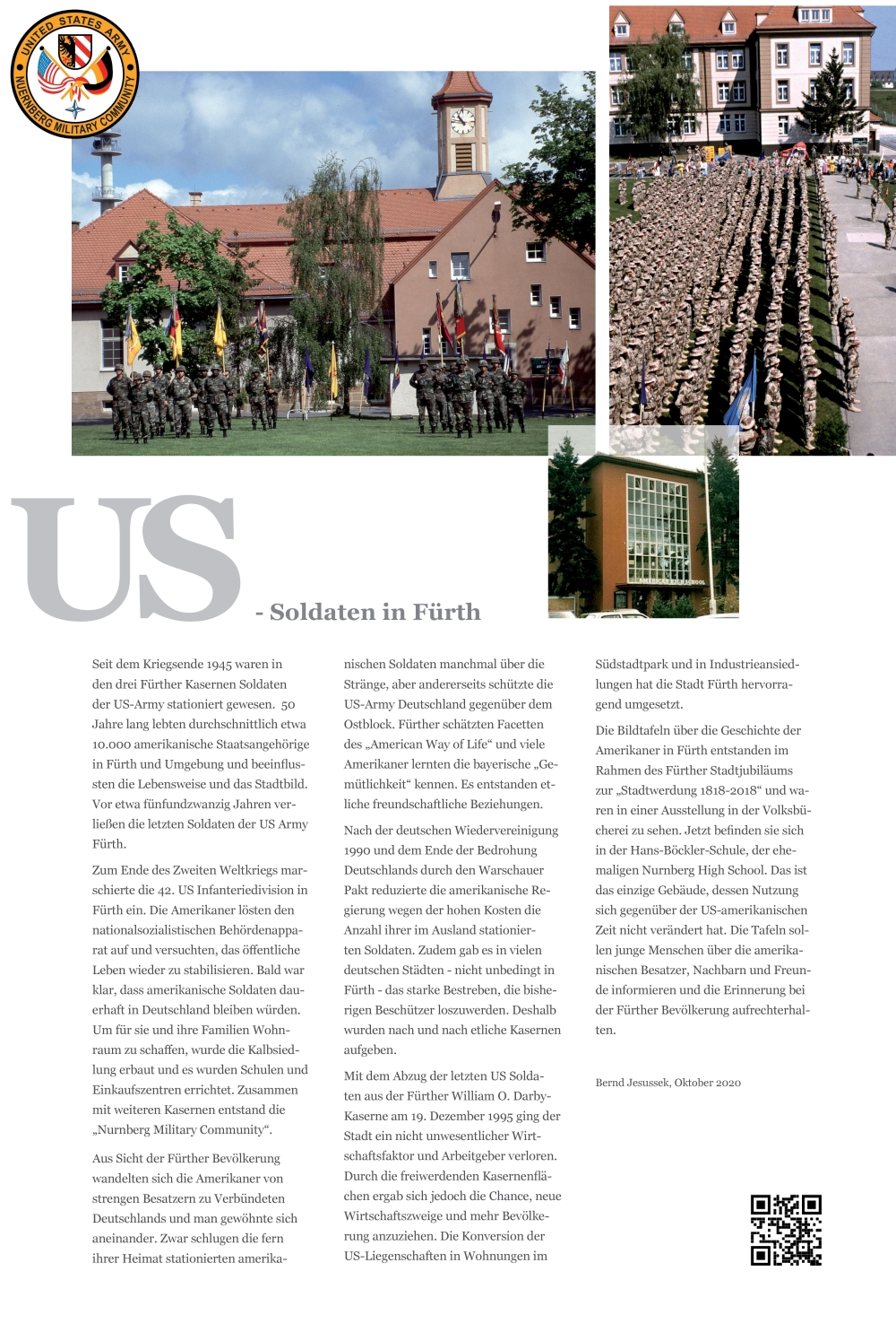 The panels were part of the exhibition of the city of Fuerth "200 Years Of Independence", Sept./Oct. 2018. The additional catalogue was published by the City of Fuerth, BMPA, with 60 pages and 99 photos. Die Tafeln skizzieren den Einfluss der US Army auf die Stadt Fürth - als Besatzungsmacht, als Nachbarn und Freunde.