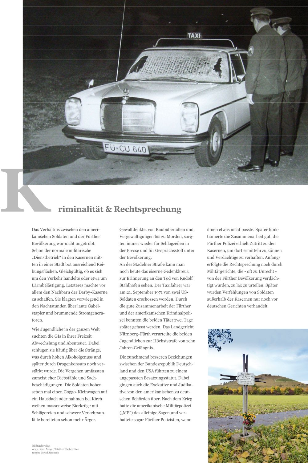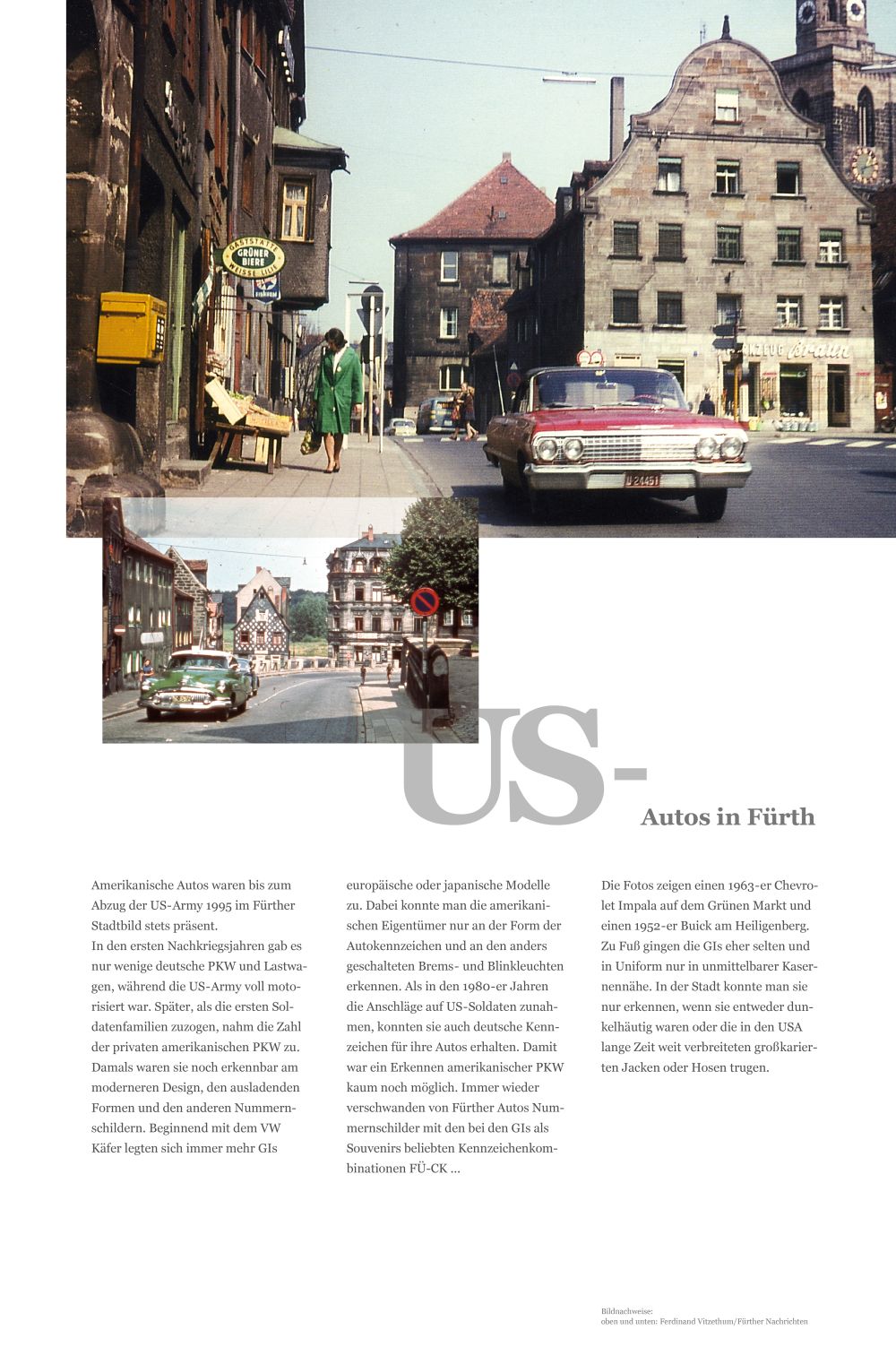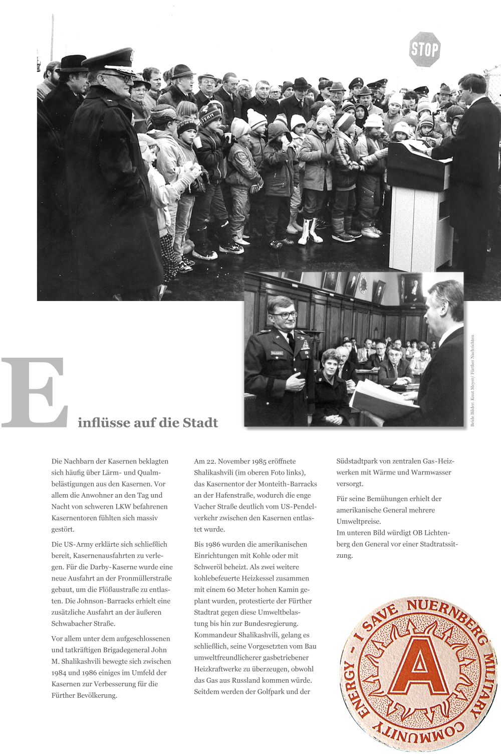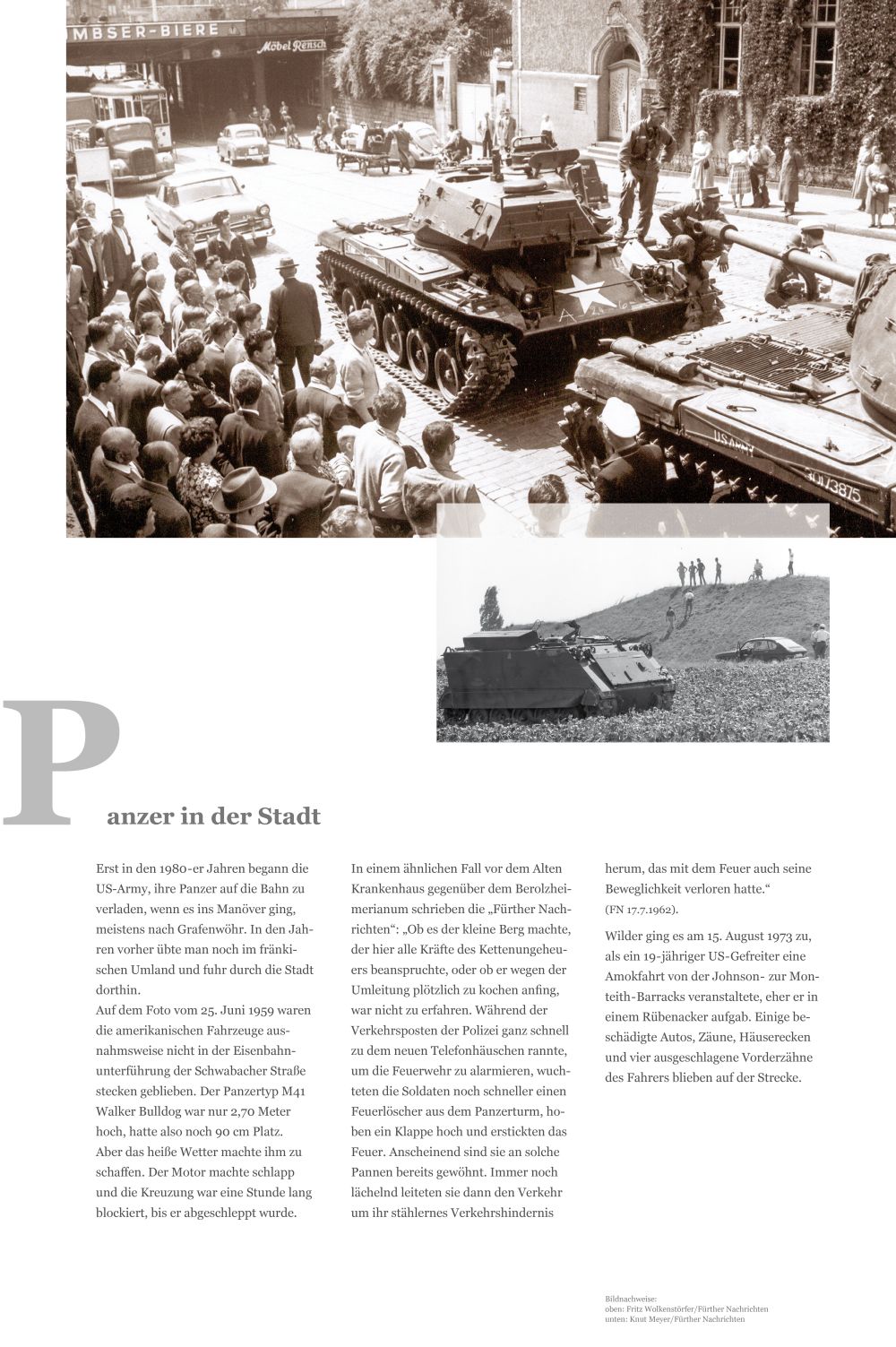 The panels were part of the exhibition of the city of Fuerth "200 Years Of Independence", Sept./Oct. 2018. The additional catalogue was published by the City of Fuerth, BMPA, with 60 pages and 99 photos. Die Tafeln skizzieren den Einfluss der US Army auf die Stadt Fürth - als Besatzungsmacht, als Nachbarn und Freunde.