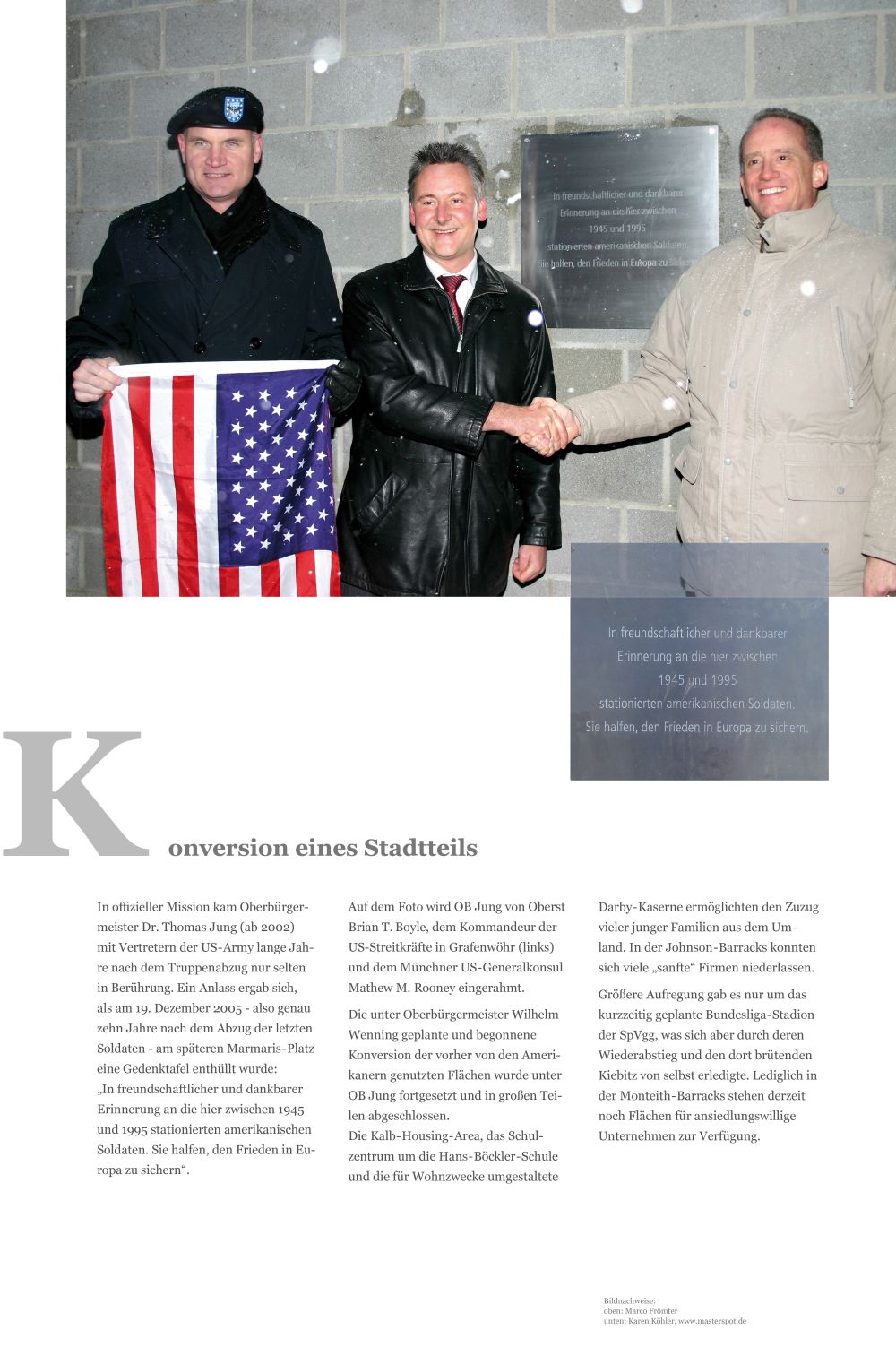 On an official mission, Lord Mayor Dr. Thomas Jung (from 2002) only rarely came into contact with representatives of the US Army for many years after the troop withdrawal. One reason arose when on December 19, 2005 - exactly ten years after the last soldiers left - a memorial plaque was unveiled on what would later become Marmaris Square. “In friendly and grateful memory of the American soldiers stationed here between 1945 and 1995. They helped to secure peace in Europe ”. In the photo, Mayor Jung is framed by Colonel Brian T. Boyle, the commander of the US armed forces in Grafenwoehr (left) and the Munich US Consul General Mathew M. Rooney. The conversion of the areas previously used by the Americans, which was planned and started under Lord Mayor Wilhelm Wenning, was continued under Mayor Jung and largely completed. The Kalb Housing Area, the school center around the Hans Böckler School and the Darby barracks, which were redesigned for residential purposes, enabled many young families to move in from the surrounding area. Many "soft" firms have settled in Johnson Barracks. There was only greater excitement about the short-term planned Bundesliga stadium of the SpVgg, but this was done by itself through their relegation and the lapwing breeding there. Only in the Monteith Barracks is there still space available for companies willing to settle. |