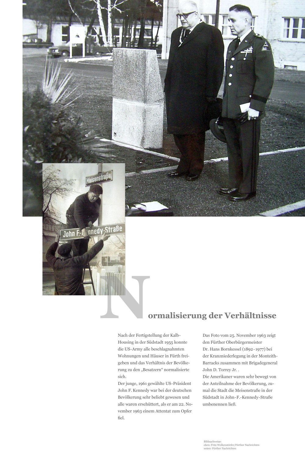 After the completion of Kalb-Housing in the Suedstadt in 1955, the US Army was able to release all confiscated apartments and houses in Fuerth and the relationship between the population and the "occupiers" normalized. The young US President John F. Kennedy, elected in 1961, was very popular with the German population and everyone was shocked when he was assassinated on November 22, 1963. The photo from November 25, 1963 shows the lord mayor of Fürth, Dr. Hans Bornkessel (1892-1977) laying the wreath in the Monteith Barracks together with Brigadier General John D. Torrey Jr. The Americans were very moved by the sympathy of the population, especially since the city renamed the Meisenstrasse in the Kalb Housing to of John-F.-Kennedy-Strasse. |