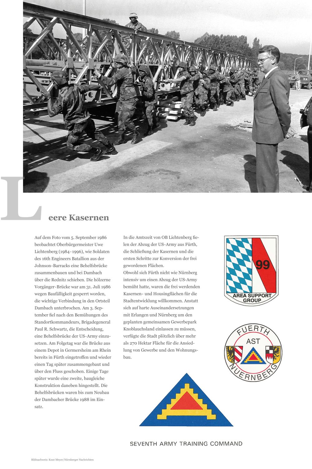 On the photo from September 5, 1986 Fuerth Lord Mayor Lichtenberg observes how soldiers of the 16th Engineers Battalion from the Johnson Barracks assemble a makeshift bridge and push it over the Rednitz near Dambach. The wooden previous bridge was closed on July 31, 1986 due to dilapidation, the important connection to the Dambach district was interrupted. On September 3, after the efforts of the site commander, Brigadier General Paul R. Schwartz, the decision was made to use a temporary bridge for the US Army. The next day, the bridge from a depot in Germersheim am Rhein had already arrived in Fuerth, and one day later it was reassembled and pushed across the river. A few days later, a second, identical construction was placed next to it. The makeshift bridges were in use until the Dambach Bridge was rebuilt in 1988. During the term of office of Mayor Uwe Lichtenberg (1984-1996) the US Army withdrew from Fuerth, the barracks were closed and the first steps were taken to convert the vacant space. Although Fuerth had not tried hard to get the US Army out of the way like Nuremberg, the barracks and housing areas that became free were welcome for urban development. Instead of having to engage in hard disputes with Erlangen and Nuremberg about the planned joint Knoblauchsland industrial park, the city suddenly had more than 270 hectares of space for business and residential construction. |
