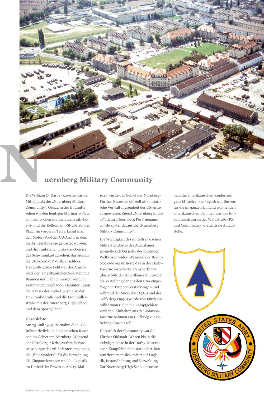 The William O. Darby barracks was the center of the "Nuernberg Military Community". Exactly in the middle of the photo we see today's Marmaris-Platz, from the top right Isaak-Loewi and Kellermann-Straße open onto the square. In the front part you can see the US Army's engine pool, in which the army vehicles were serviced, and the gas station. To the left of it you can see the swimming pool, which adjoined the “Schickedanz” villa. The large green field was the roll call area for the American soldiers with trees and flagpoles in front of the command building. Behind it are the Kalb-Housing houses on Dr.-Frank-Straße and Fronmüllerstraße with the Nuernberg High School and the sports grounds. History: On July 25, 1945, the 1st US Infantry Division took over the German barracks in the Nuremberg area. During the Nuremberg war crimes trials, the 26th Infantry Regiment, the "Blue Spaders", provided security, billeting and logistics in the area surrounding the trials. On May 17, 1946, the area of the Nuremberg-Fuerth barracks was officially designated as a military administrative unit of the US Army. First called the “Nuernberg Enclave”, then called the “Nuernberg Post”, which later became the “Nuernberg Military Community”. The importance of the Middle Franconian military base for the Americans was reflected in each of the subsequent world crises. During the Berlin bloc, the transport office installed in the Darby barracks (the largest of the Americans in Europe) organized the distribution of troop reinforcements flown in from the USA and during the Suez Crisis (1956) and the Gulf War (1990 ) military material was loaded from Fuerth from into the combat areas. Units from the Johnson barracks also took part in this war to liberate Kuwait. The heart of the community was in the southern part of Fuerth. While combat units were still stationed in the Darby barracks until the 1970s, the focus was later on logistics, maintenance and administration. American children from all over Middle Franconia were brought to Nuernberg High School every day by buses, and the shopping center on Waldstrasse (PX and Commissary) was the central point of contact for American families living all over the area. |