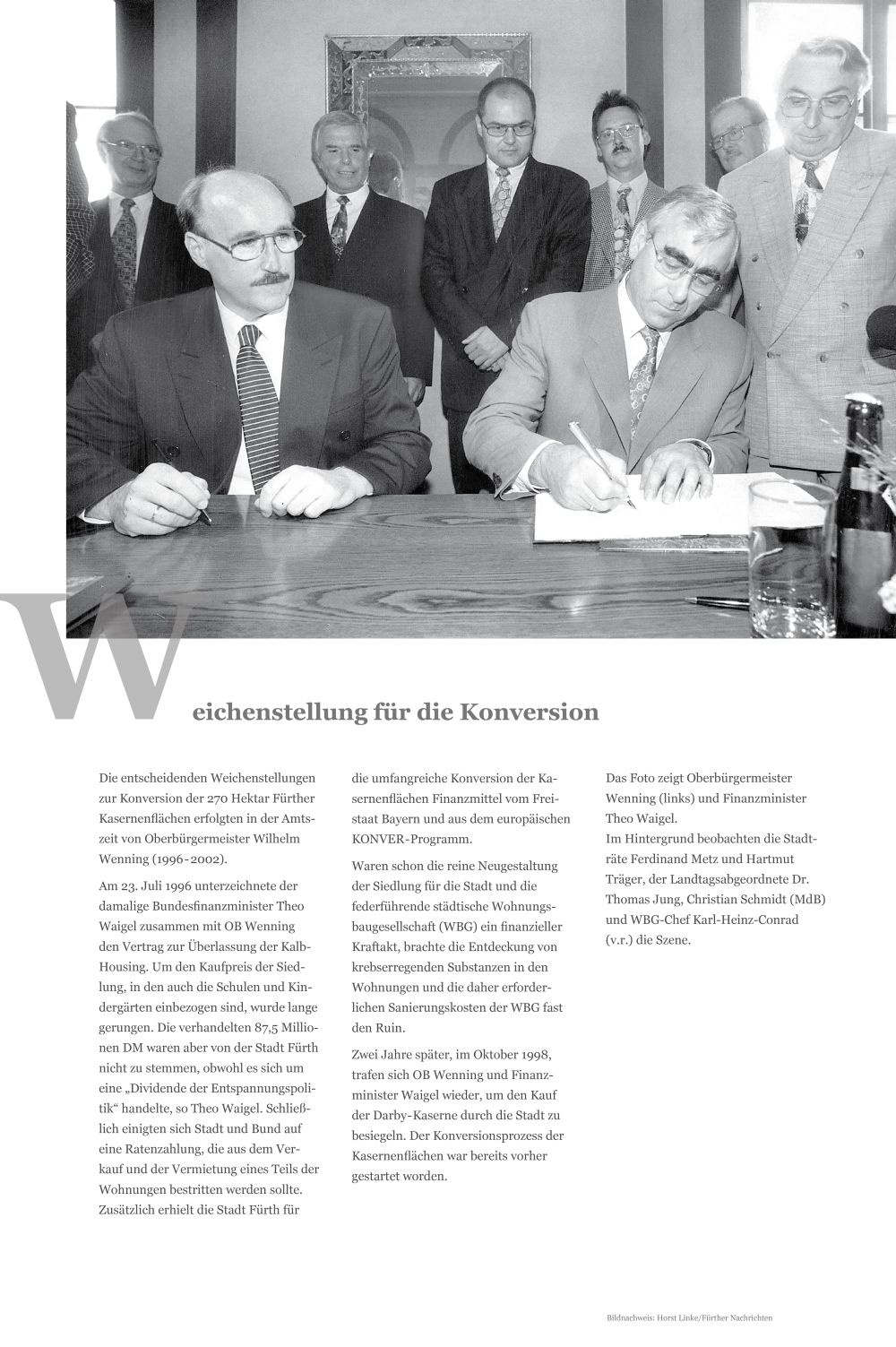 The decisive course for the conversion of the barracks area of 270 hectares of Fuerth barracks area took place during the term of office of Lord Mayor Wilhelm Wenning (1996-2002). On July 23, 1996, the then Federal Minister of Finance, Theo Waigel, signed the contract for the provision of Kalb-Housing together with OB Wenning. The purchase price of the settlement, in which the schools and kindergartens are also included, was a long struggle. However, the negotiated 87.5 million DM could not be raised by the city of Fuerth, although it was a "dividend from the policy of détente", according to Theo Waigel. Finally, the city and federal government agreed on an installment payment, which was to be paid for from the sale and rental of part of the apartments. In addition, the city of Fuerth received funding from the Free State of Bavaria and from the European KONVER program for the extensive conversion of the barracks. The mere redesign of the settlement was a financial feat for the city and the leading municipal housing association (WBG), but the discovery of carcinogenic substances in the apartments and the necessary renovation costs almost ruined the WBG. Two years later, in October 1998, Mayor Wenning and Finance Minister Waigel met again to seal the city's purchase of the Darby Kaserne. The conversion process of the barracks areas had already started beforehand. |