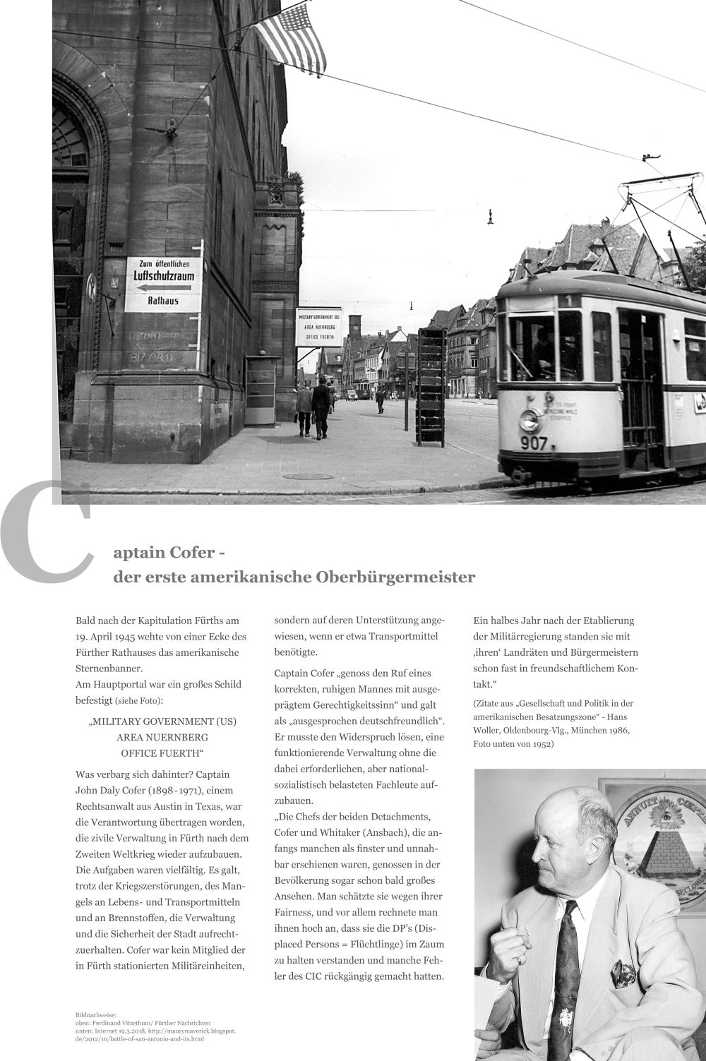 Soon after Fuerth's surrender on April 19, 1945, the American stars and stripes blew from a corner of the Fuerth town hall. A large sign was attached to the main portal: "MILITARY GOVERNMENT (US) AREA NUERNBERG OFFICE FUERTH " (see photo). What was behind it? Captain John Daly Cofer (1898-1971), a lawyer from Austin, Texas, was given responsibility for rebuilding the civil administration in Fuerth after the Second World War. The tasks were manifold. The task was to maintain the administration and the security of the city despite the war damage, the lack of food, transport and fuel. Cofer was not a member of the military units stationed in Fürth, but relied on their support when he needed means of transport. Captain Cofer "enjoyed the reputation of a correct, calm man with a pronounced sense of justice" and was considered to be "extremely German-friendly". He had to solve the contradiction of building a functioning administration without the necessary but Nazi-burdened specialists. “The heads of the two detachments, Cofer and Whitaker (Ansbach), who at first seemed dark and aloof to some, soon enjoyed a great reputation among the population. They were valued for their fairness, and above all they were given credit for their ability to keep the DPs (displaced persons = refugees) in check and for having reversed some of the CIC's mistakes. Half a year after the establishment of the military government, they were almost in friendly contact with "their" district administrators and mayors. " It is not known exactly when Captain Cofer handed over the post of Military Governor to his successor, Steward Hillard. (Quotes from "Society and Politics in the American Zone of Occupation" - Hans Woller, Oldenbourg-Vlg., Munich 1986) |