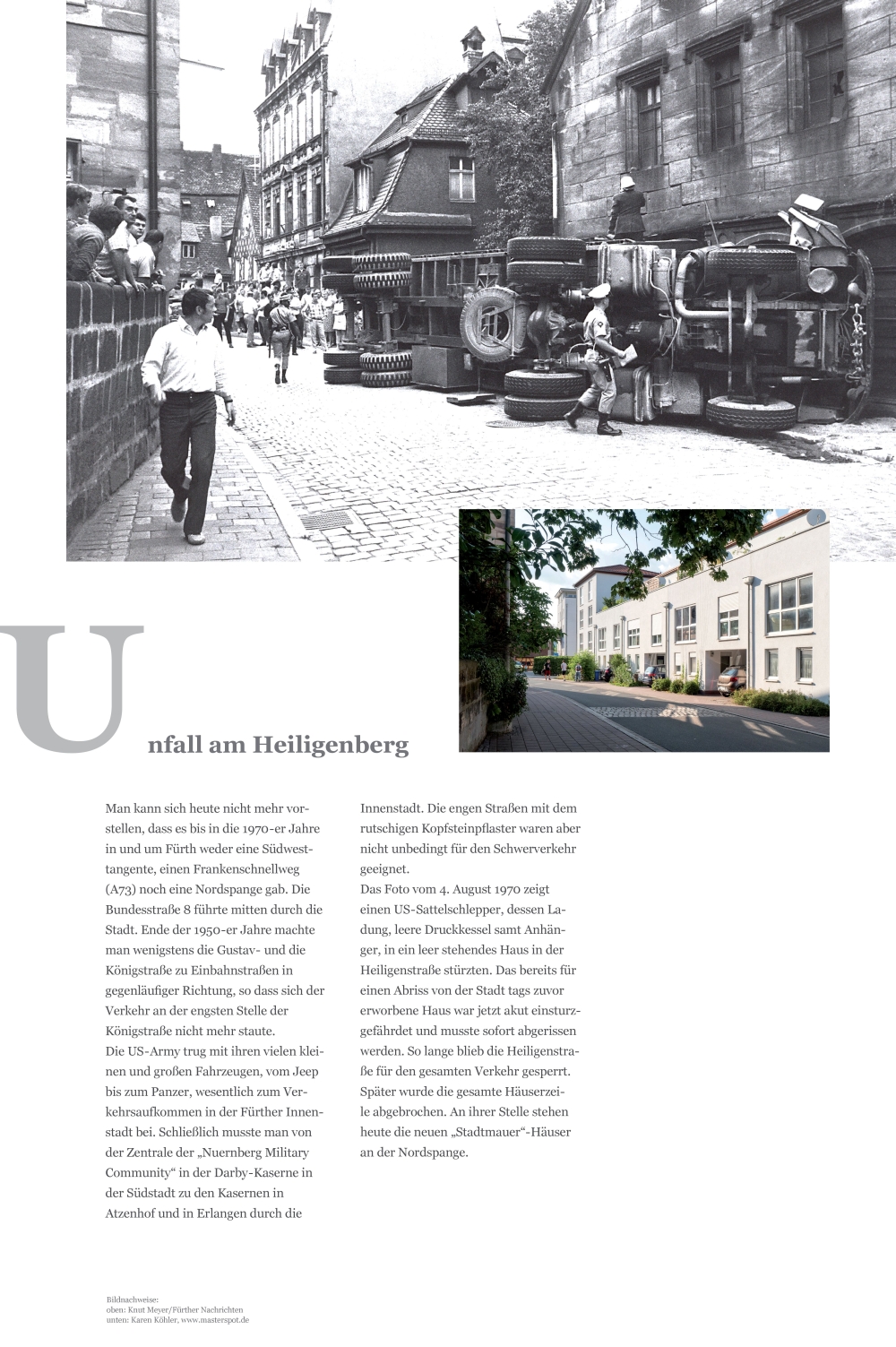 Today, one can no longer imagine that there was neither a south-west bypass, a Frankenschnellweg (A73) nor a highway northbound in and around Fuerth until the 1970s. The federal highway No. 8 ran right through the city. At the end of the 1950s, at least Gustavstrasse and Königstrasse were made into one-way streets in opposite directions, so that traffic no longer congested at the narrowest part of Königstrasse. With its many small and large vehicles, from jeeps to tanks, the US Army contributed significantly to the volume of traffic in downtown Fuerth. After all, you had to go from the headquarters of the Nuernberg Military Community in the Darby Kaserne in Suedstadt to the barracks in Atzenhof and Erlangen through the center of the city. The narrow streets with the slippery cobblestones were not necessarily suitable for heavy traffic. The photo from August 4, 1970 shows a US articulated lorry whose load, empty pressure vessels, including trailer, crashed into an empty house on Heiligenstrasse. The house, which the city had already bought for demolition the day before, was now in acute danger of collapsing and had to be torn down immediately. For that time Heiligenstrasse was closed to all traffic. The entire row of houses was later demolished. In their place are now the new "city wall" houses on the "Nordspange". |