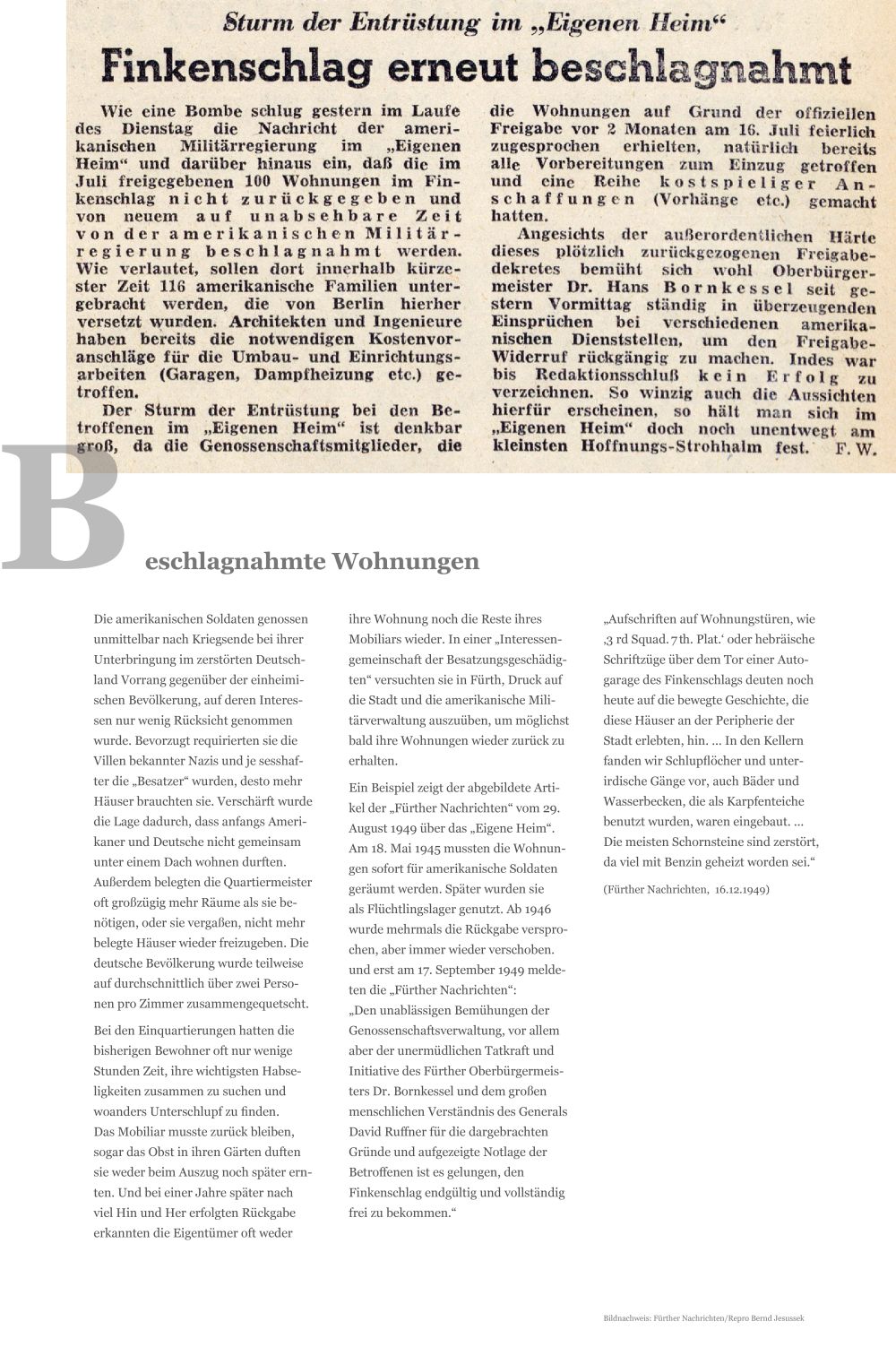 When they were housed in destroyed Germany, the American soldiers enjoyed priority over the local population, whose interests were given little consideration. They preferred to requisition the villas of well-known Nazis and the more settled the "occupiers" became, the more houses they needed. The situation was exacerbated by the fact that at first Americans and Germans were not allowed to live together under one roof. In addition, the district masters often generously occupied more rooms than they needed, or they forgot to release houses that were no longer occupied. The German population was sometimes squeezed to an average of over two people per room. When billeting, the previous residents often only had a few hours to look for their most important belongings and find shelter elsewhere. The furniture had to be left behind, even the fruit in their gardens thwy could not harvest any more when they moved out. And when the house was returned a year later, after a lot of back and forth, the owners often did not recognize either their apartment or the remains of their furniture. In a “community of interests of the occupation victims” in Fuerth they tried to put pressure on the city government and the American military administration in order to get their apartments back as soon as possible. An example is shown in the article in the “Fürther Nachrichten” from August 29, 1949 about “Eigenes Heim”. On May 18, 1945, the apartments had to be vacated for American soldiers immediately. They were later used as a refugee camp. From 1946 the return was promised several times, but was repeatedly postponed. And it was not until September 17, 1949 that the “Fürther Nachrichten” reported: “The relentless efforts of the cooperative administration, but above all the tireless energy and initiative of the mayor of Fuerth, Dr. Bornkessel and the great human understanding of General David Ruffner for the reasons presented and the plight of those affected, we managed to finally and completely free the finch attack come." "Inscriptions on apartment doors, such as' 3 rd Squad. 7 th. Plat. ‘Or Hebrew lettering above the gate of a car garage from the Finkenschllag still point to the eventful history that these houses on the outskirts of the city experienced. ... In the cellars we found loopholes and underground passages, and baths and water basins that were used as carp ponds were also built in. ... Most of the chimneys have been destroyed because a lot of gasoline was used for heating. " (Fürther Nachrichten, December 16, 1949) |