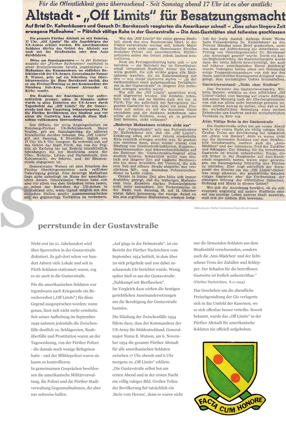 Not only in the 21st century is there a discussion about closing times in Gustavstrasse. There were many restaurants there a hundred years ago and since soldiers were stationed in Fürth, they have also been drawn to Gustavstrasse. At some point after the end of the war, American soldiers were prohibited from visiting this area (“Off Limits”); when exactly could not be determined. In any case, since its abolition in September 1949, the number of incidents has increased significantly. Fights, robberies and prostitution were the order of the day, and they could hardly be controlled by the Fuerth police (which at that time still had few authority) and the military police. In joint discussions, the American military administration, the police and the Fuerth city administration decided on countermeasures, but these only helped temporarily. “Auf gehts in der Helmstrasse” is the title of a report in the Fürther Nachrichten from September 1954, in which 20 GIs were fighting and 100 were watching. A little later it was said from Gustavstrasse: “Close combat with beer bottles”. In comparison, today's legal disputes over the calming of Gustavstrasse seem harmless. The accumulation of incidents in 1954 meant that the commander of the US Army for southern Germany, Major General Numa E. Watson, on November 6, 1954, called the entire old town of Fuerth to "Off Limits" for all American soldiers between 5 p.m. and 6 a.m. explained. “Gustavstrasse itself offered a completely calm picture on the first evening and the first night. Large parts of the population actually took a 'stone from their hearts', because not only had the noisy soldiers disappeared from the streets, but also the 'American girls' and the light-shy entourage of pimps and smugglers. The damage to the innkeepers affected is undeniable, ”(Fürther Nachrichten, November 8th, 1954). The event around the evening leisure activities of the GIs shifted to the area around the barracks, where it was apparently better distributed. As far as is known, the "Off Limits" in the old town of Fürth has never been officially lifted for American soldiers. |