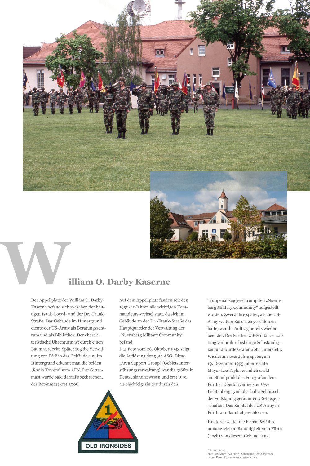 Since the end of the war in 1945, soldiers from the US Army had been stationed in the three barracks in Fuerth. For fifty years, an average of around 10,000 American citizens lived in Fuerth and the surrounding area and influenced the way of life and the cityscape. The last soldiers of the US Army left Fuerth around twenty-five years ago. At the end of the Second World War, the 42nd US Infantry Division marched into Fuerth. The Americans dissolved the National Socialist authorities and tried to stabilize public life again. It soon became clear that American soldiers would stay in Germany permanently. In order to create living space for them and their families, the Kalb Housing was built and schools and shopping centers were built. Together with other barracks, the "Nurnberg Military Community" was created. From the point of view of the people of Fuerth, the Americans changed from strict occupiers to allies of Germany and they got used to each other. The American soldiers stationed far from their homes sometimes went over the limit, but on the other hand the US Army protected Germany from the Eastern Bloc. Fürther valued facets of the “American way of life” and many Americans got to know the Bavarian “cosiness”. A number of friendly relationships developed. After the German reunification in 1990 and the end of the Warsaw Pact threat to Germany, the American government reduced the number of soldiers stationed abroad because of the high costs. In addition, in many German cities - not really in Fuerth - there was a strong effort to get rid of the previous protectors. Therefore, a number of barracks were gradually given up. With the withdrawal of the last US soldiers from the Fuerth William O. Darby barracks on December 19, 1995, the city lost a not insignificant economic factor and employer. However, the barracks freed up gave the opportunity to attract new branches of the economy and a larger population. The city of Fuerth has implemented the conversion of US properties into apartments in Südstadtpark and in industrial settlements.