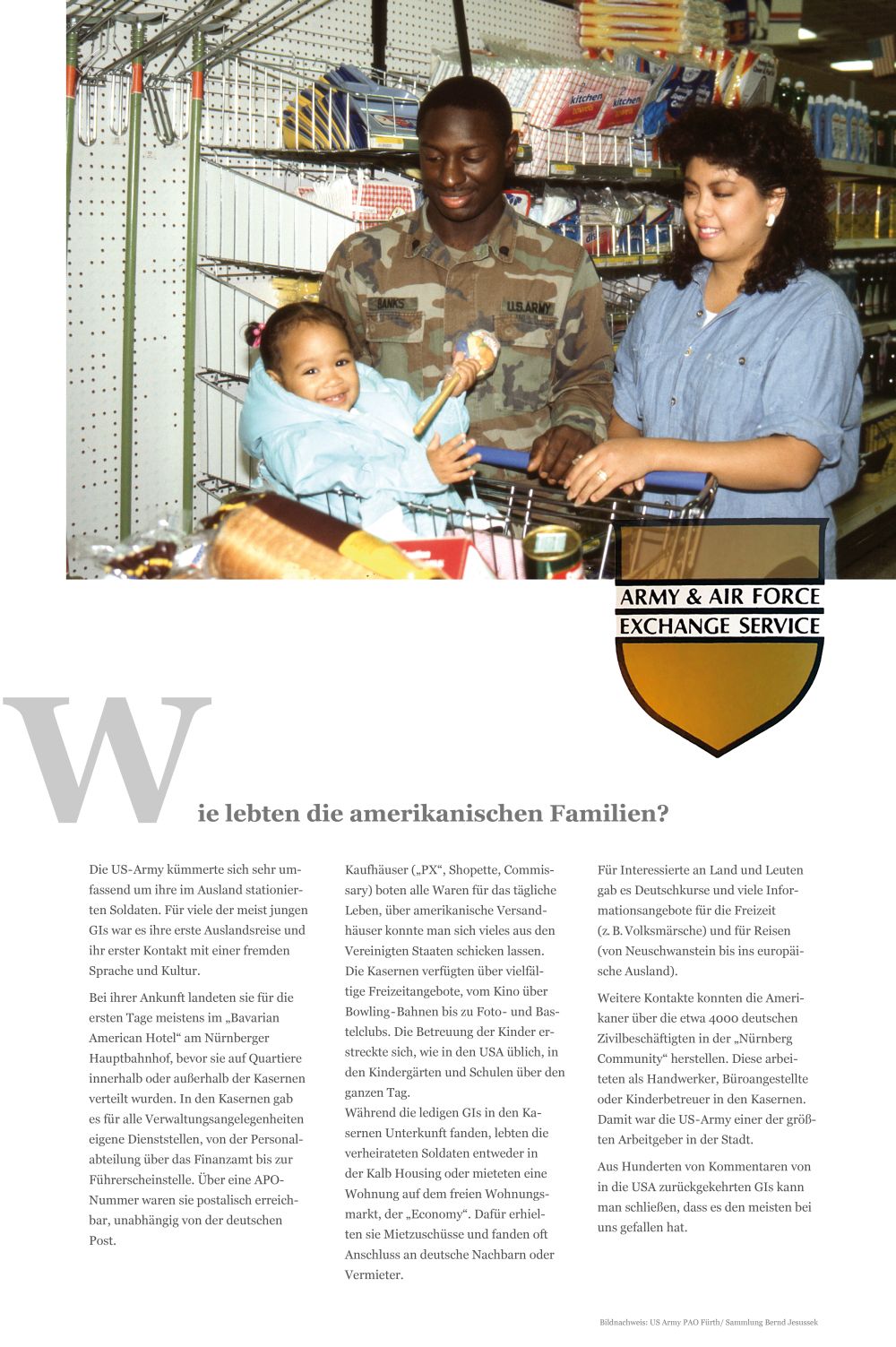 The US Army took great care of its soldiers stationed abroad. For many of the mostly young GIs it was their first trip abroad and their first contact with a foreign language and culture. When they arrived, they mostly ended up in the “Bavarian American Hotel” at Nuremberg Central Station for the first few days before they were distributed to quarters inside or outside the barracks. In the barracks there were separate offices for all administrative matters, from the personnel department to the tax office to the driver's license office. They could be reached by mail via an APO number, independent of the German post. Department stores ("PX", Shopette, Commissary) offered all the goods for everyday life, and American mail order houses offered many items from the United States. The barracks had a wide range of leisure activities, from the cinema and bowling alley to photo and handicraft clubs. As is customary in the USA, the care of the children in kindergartens and schools was extended throughout the day. While the single GIs found accommodation in the barracks, the married soldiers either lived in the Kalb Housing or rented an apartment on the free housing market, the “economy”. For this they received rent subsidies and often found contact with German neighbors or landlords. For those interested in the country and its people, there were German courses and lots of information on leisure (e.g. folk marches) and for travel (from Neuschwanstein to other European countries). The Americans were able to establish further contacts through the approximately 4,000 German civilian employees in the “Nurnberg Community”. These worked as craftsmen, office workers or child carers in the barracks. This made the Americans one of the largest employers in the city. From hundreds of comments from GIs returned to the US, it can be concluded that most of them enjoyed their stay here. |