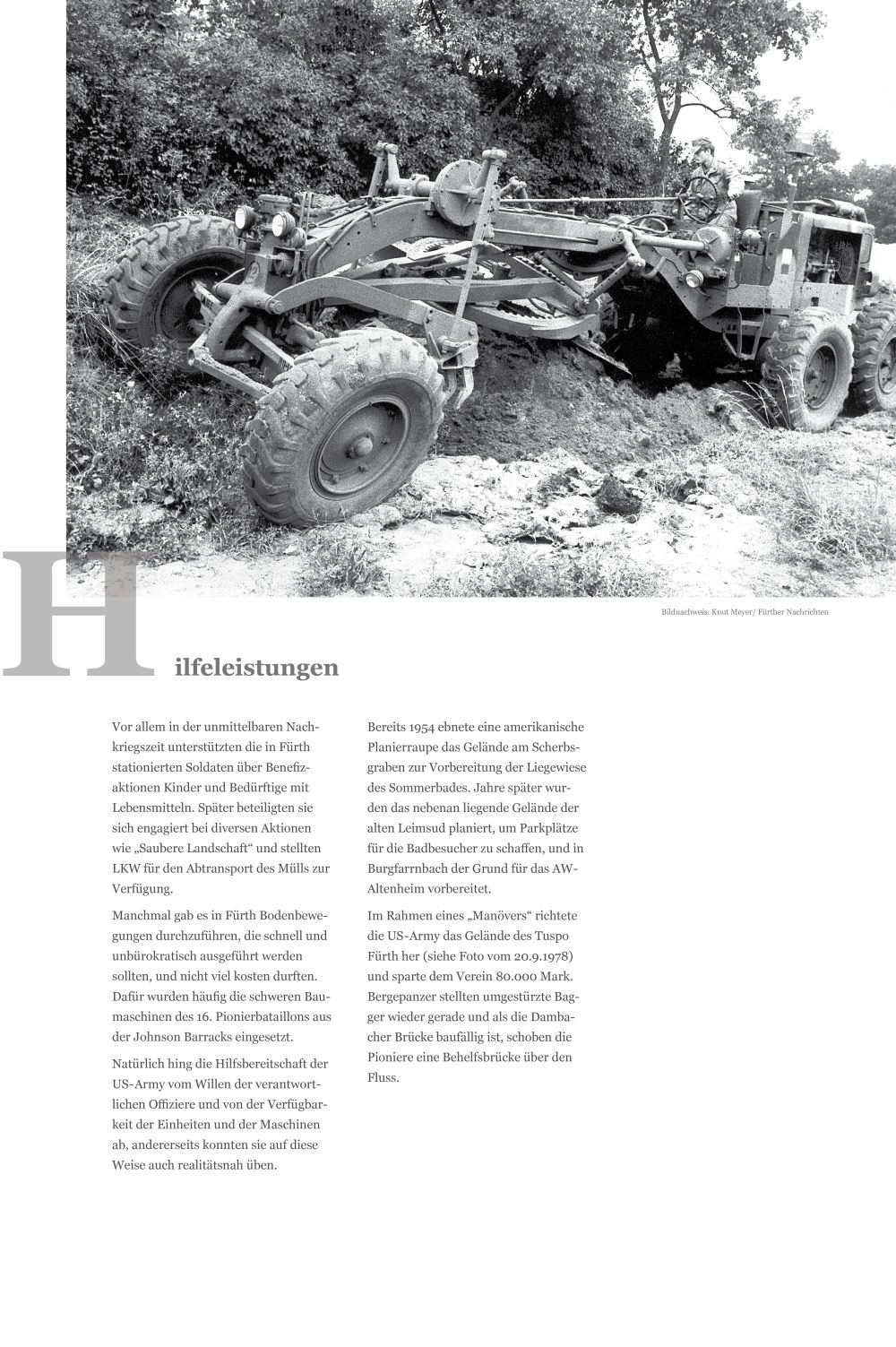 In the immediate post-war period in particular, the soldiers stationed in Fuerth supported children and the needy with food through charity campaigns. Later they actively participated in various campaigns such as “clean landscape” and provided trucks for the removal of the garbage. Sometimes there were ground movements to be carried out in Fuerth, which should be carried out quickly and unbureaucratically and which should not cost a lot. The heavy construction machines of the 16th Engineer Battalion from the Johnson Barracks were often used for this. Of course, the willingness of the US Army to help depended on the will of the officers in charge and on the availability of the units and machines, but on the other hand they were able to practice realistically in this way. As early as 1954, an American bulldozer leveled the area on the Scherbsgraben to prepare the lawn for the summer pool. Years later, the neighboring site of the old Leimsud was leveled to create parking spaces for visitors to the pool, and the ground for the AW retirement home was prepared in Burgfarrnbach. As part of a "maneuver", the US Army prepared the grounds of Tuspo Fuerth (see photo from September 20, 1978) and saved the club 80,000 marks. Armored recovery vehicles straightened overturned excavators and when the Dambacher Bridge was dilapidated, the pioneers quickly pushed a temporary bridge over the river. |