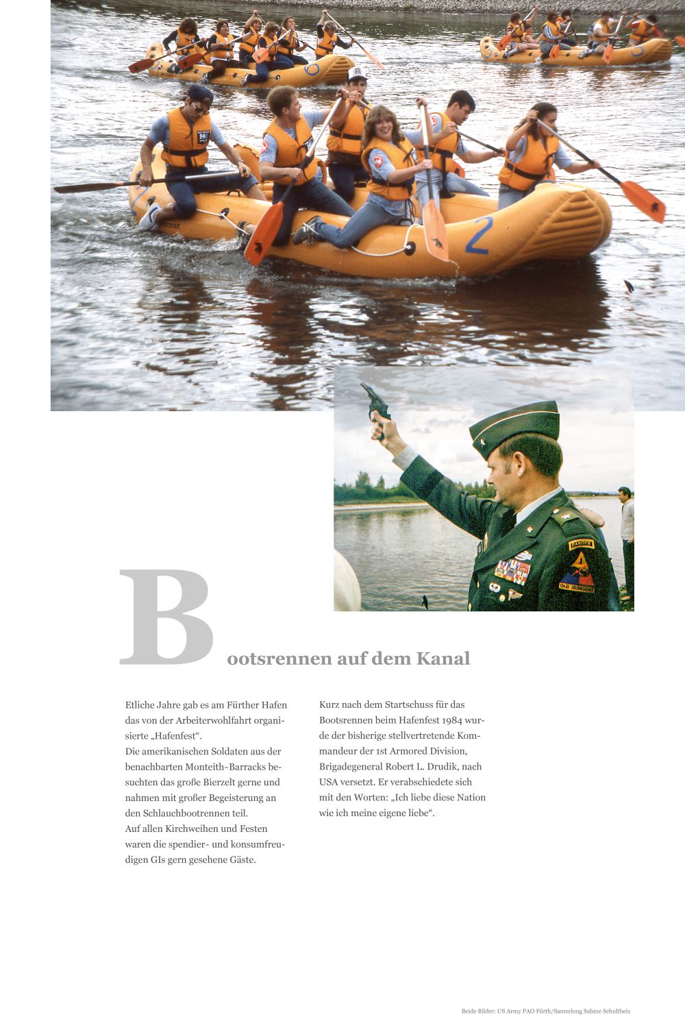 For a number of years there was the "Hafenfest" organized by the workers' welfare organization at the Fuerth harbor of the Main-Danube-Canal. The American soldiers from the neighboring Monteith Barracks liked to visit the big beer tent and took part in the rubber dinghy races with great enthusiasm. The GIs who were happy to spend and consume were welcome guests at all church fairs and festivals. |