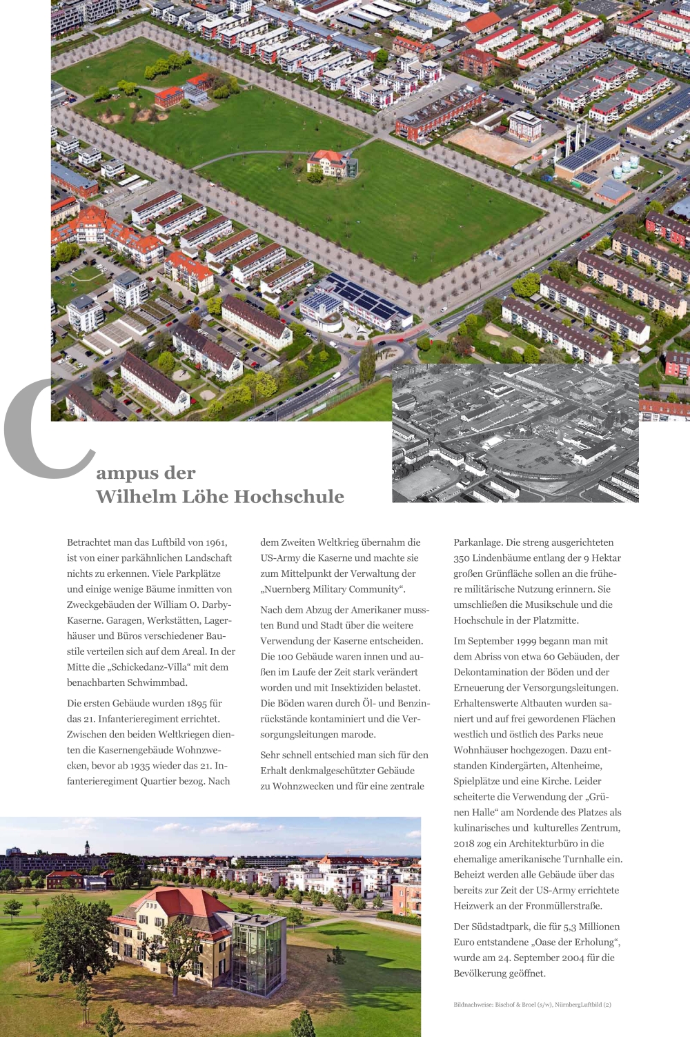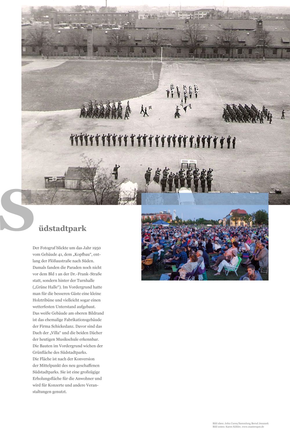 If you look at the aerial photo from 1961, nothing of a park-like landscape can be seen. Lots of parking spaces, small green spaces and a few trees in the midst of functional buildings from the William O. Darby Kaserne, garages, workshops, warehouses and offices of various architectural styles are spread across the area. In the middle is the “Schickedanz Villa” with an adjacent swimming pool. The first buildings were erected in 1895 for the 21st Infantry Regiment. Between the two world wars, the barracks buildings were used for residential purposes before the 21st Infantry Regiment moved back into quarters in 1935. After the Second World War, the US Army took over the barracks and made it the center of administration for the “Nuernberg Military Community”. After the Americans left, the federal government and the city had to decide on the further use of the barracks. The 100 buildings had undergone major changes inside and out over time and were contaminated with insecticides. The floors were contaminated by oil and petrol residues and the supply lines were ailing. A decision was made very quickly to preserve listed buildings for residential purposes and to have a central park. The strictly aligned 350 linden trees along the 9 hectare green area are intended to remind of the earlier military use. They enclose the music school and the university in the middle of the square. In September 1999, the demolition of around 60 buildings, the decontamination of the floors and the renewal of the supply lines began. Old buildings worth preserving have been renovated and new residential buildings have been built on the vacated areas to the west and east of the park. In addition, kindergartens, old people's homes, playgrounds and a church were built. Unfortunately, the use of the “Green Hall” at the north end of the square as a culinary and cultural center failed, and in 2018 an architecture firm moved into the former American gymnasium. All buildings are heated by the heating plant on Fronmüllerstrasse, which was built at the time of the US Army. The Südstadtpark, the "oasis of relaxation" created for 5.3 million euros, was opened to the public on September 24, 2004. |