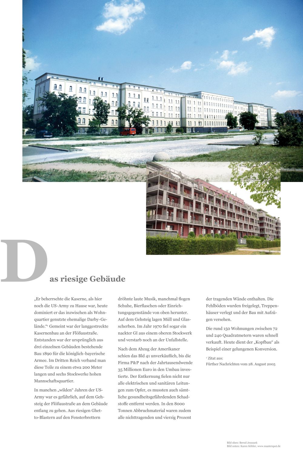 “He ruled the barracks when the US Army was still at home here, today he dominates the former Darby site, which is now used as a residential area.” This meant the elongated building on Flößaustrasse. The building, which originally consisted of three individual buildings, was built in 1890 for the royal Bavarian army. In the Third Reich, these parts were combined to form a crew quarters around 200 meters long and six stories high. In some of the “wild” years of the US Army, it was dangerous to walk along the pavement of Flößaustrasse near the building. Loud music boomed from huge ghetto blasters on the window sills, sometimes shoes, beer bottles or furnishings flew down from above. Trash and broken glass lay on the sidewalk. In 1970 a naked GI fell from an upper floor and died at the scene of the accident. After the Americans left, Bld 41 seemed unsaleable until the P&P company invested 35 million Euro in the renovation after the turn of the millennium. Not only did all electrical and sanitary cables fall victim to the gutting, all harmful substances also had to be removed. The 8,000 tons of demolition material also included all non-load-bearing and forty percent of the load-bearing walls. The false floors were exposed, stairwells were laid and the building was provided with elevators. The 150 or so apartments between 72 and 240 square meters were sold quickly. Today the "head building" serves as an example of a successful conversion. |