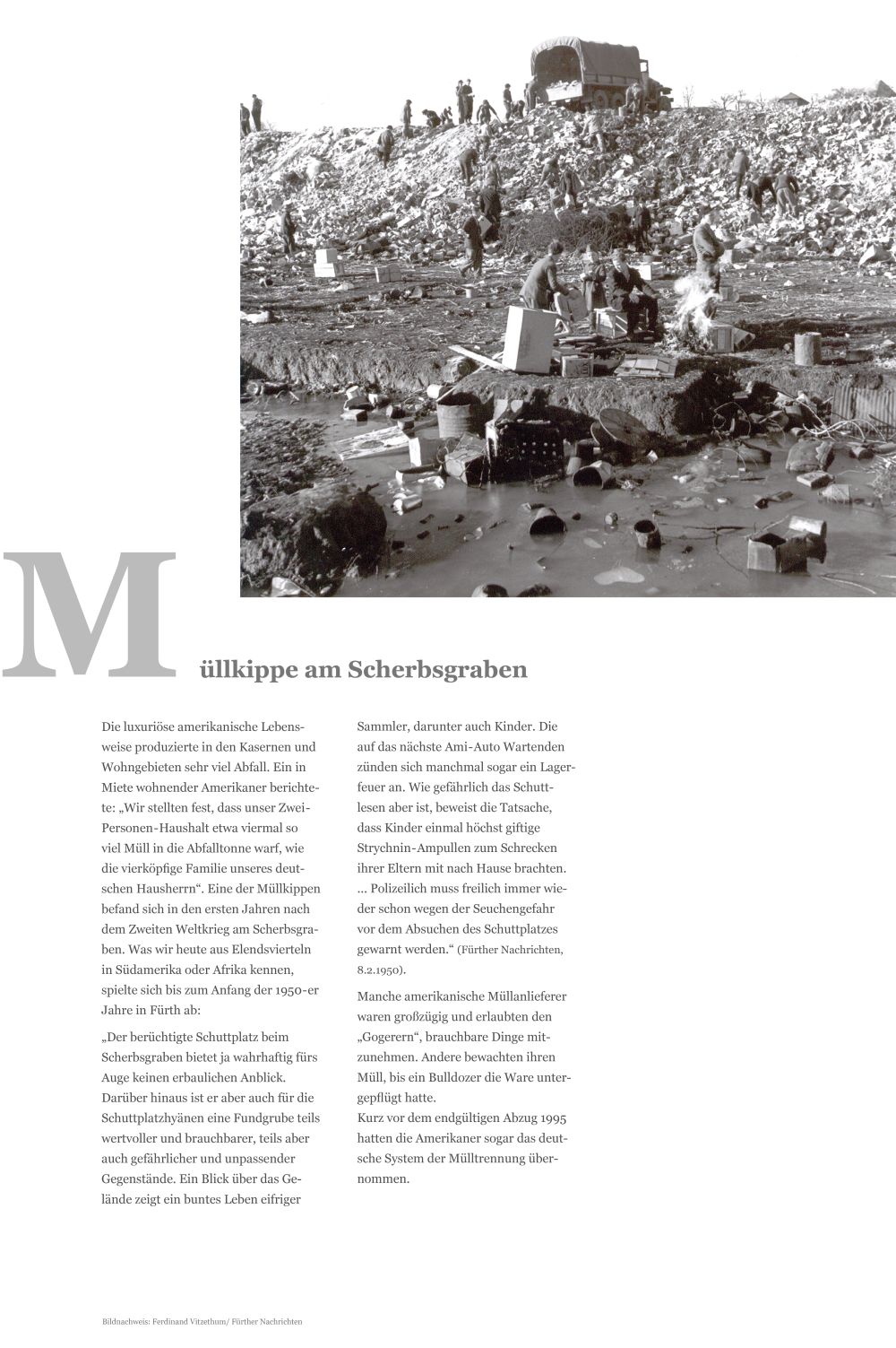 The luxurious American way of life produced a great deal of waste in the barracks and residential areas. An American living in rent reported: "We found that our two-person household threw about four times as much rubbish into the garbage can as the family of four of our German landlord". One of the garbage dumps was on the Scherbsgraben in the first years after the Second World War. What we know today from slums in South America or Africa took place in Fuerth until the beginning of the 1950s: “The notorious rubble dump at the Scherbsgraben is really not an edifying sight to the eye. In addition, it is also a treasure trove for the rubble hyenas, some valuable and useful, but also dangerous and unsuitable objects. A look over the area reveals a colorful life of avid collectors, including children. Those who are waiting for the next American car sometimes even light a campfire. How dangerous it is to read rubble is proven by the fact that children once brought home highly toxic strychnine ampoules to the horror of their parents. ... The police have to be warned again and again before searching the rubble site because of the risk of infection. ” (Fürther Nachrichten, February 8th, 1950). Some American garbage deliverers were generous and allowed the “Gogerers” to take useful things with them. Others guarded their garbage until a bulldozer plowed in the goods. Shortly before the final withdrawal in 1995, the Americans even adopted the German system of waste separation.