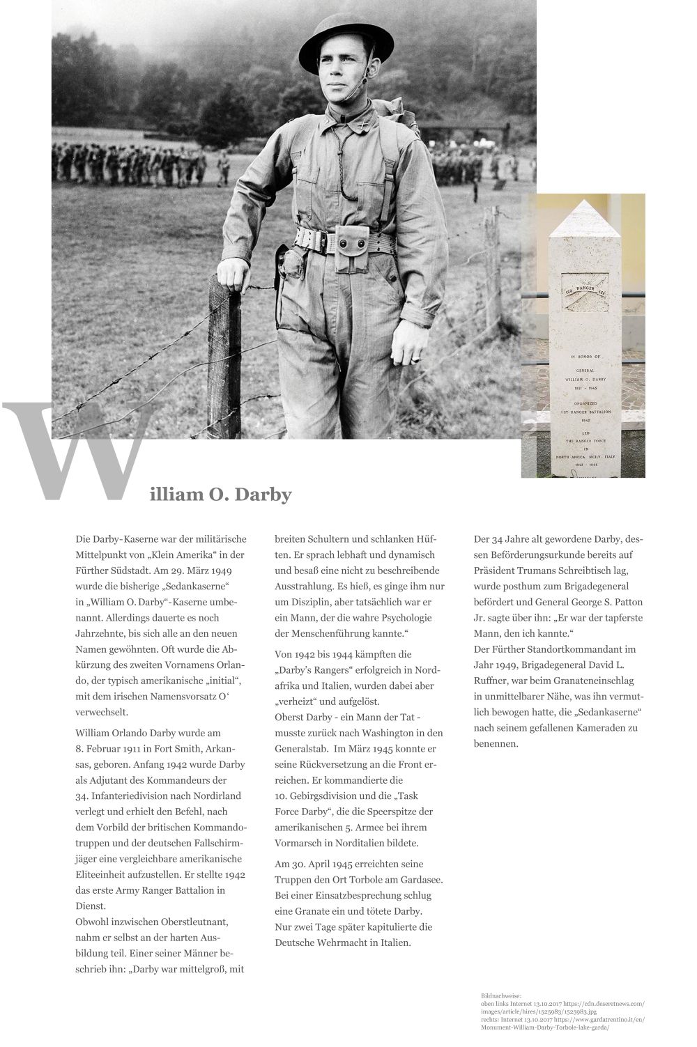 The Darby barracks was the military center of "Little America" in the southern part of Fürth. On March 29, 1949, the previous “Sedankaserne” was renamed “William O. Darby” Kaserne. However, it took decades for everyone to get used to the new name. The abbreviation of the middle name Orlando, the typical American "initial", was often confused with the Irish prefix O '. William Orlando Darby was born on February 8, 1911 in Fort Smith, Arkansas. At the beginning of 1942 Darby was transferred to Northern Ireland as adjutant to the commander of the 34th Infantry Division and was ordered to set up a comparable American elite unit based on the model of the British commandos and the German paratroopers. He put the first Army Ranger Battalion into service in 1942. Although he is now a lieutenant colonel, he himself took part in the tough training. One of his men described him: “Darby was of medium height with broad shoulders and slender hips. He spoke lively and dynamically and had an aura that could not be described. It was said that it was all about discipline, but in fact he was a man who knew the true psychology of leadership. " From 1942 to 1944, the "Darby's Rangers" fought successfully in North Africa and Italy, but were "burned up" and dissolved. Colonel Darby - a man of action - had to go back to Washington to serve on the General Staff. In March 1945 he was able to get his transfer back to the front. He commanded the 10th Mountain Division and the "Task Force Darby", which formed the spearhead of the American 5th Army on its advance into northern Italy. On April 30, 1945, his troops reached Torbole on Lake Garda. During a briefing, a grenade struck and killed Darby. Only two days later the German Wehrmacht capitulated in Italy. Darby, 34 years old, whose certificate of promotion was already on President Truman's desk, was posthumously promoted to brigade general and General George S. Patton Jr. said of him: “He was the bravest Man I knew." The Fürth site commander in 1949, Brigadier General David L. Ruffner, was in the immediate vicinity when the grenade struck, which presumably prompted him to name the “Sedankaserne” after his fallen mate. [from 27]: [27] Camp's namesake ranger leader, innovator, hero - Jeff Fry, magazine (title unknown) dated 08/20/88, owned by the author |