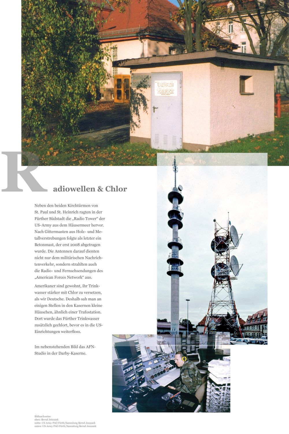 In addition to the two church towers of St. Paul and St. Heinrich, the "Radio Tower" of the US Army protruded from the sea of houses in the southern part of Fuerth. After lattice masts made of wood and metal struts, the last was a concrete mast, which was only removed in 2008. The antennas on it were not only used for military communications, but also broadcast the radio and television programs of the "American Forces Network". Americans are used to adding more chlorine to their drinking water than the Germans. Therefore, in some places in the barracks, one saw small houses, similar to a transformer station. There, the Fuerth drinking water was also chlorinated before it flowed on to the US facilities. |