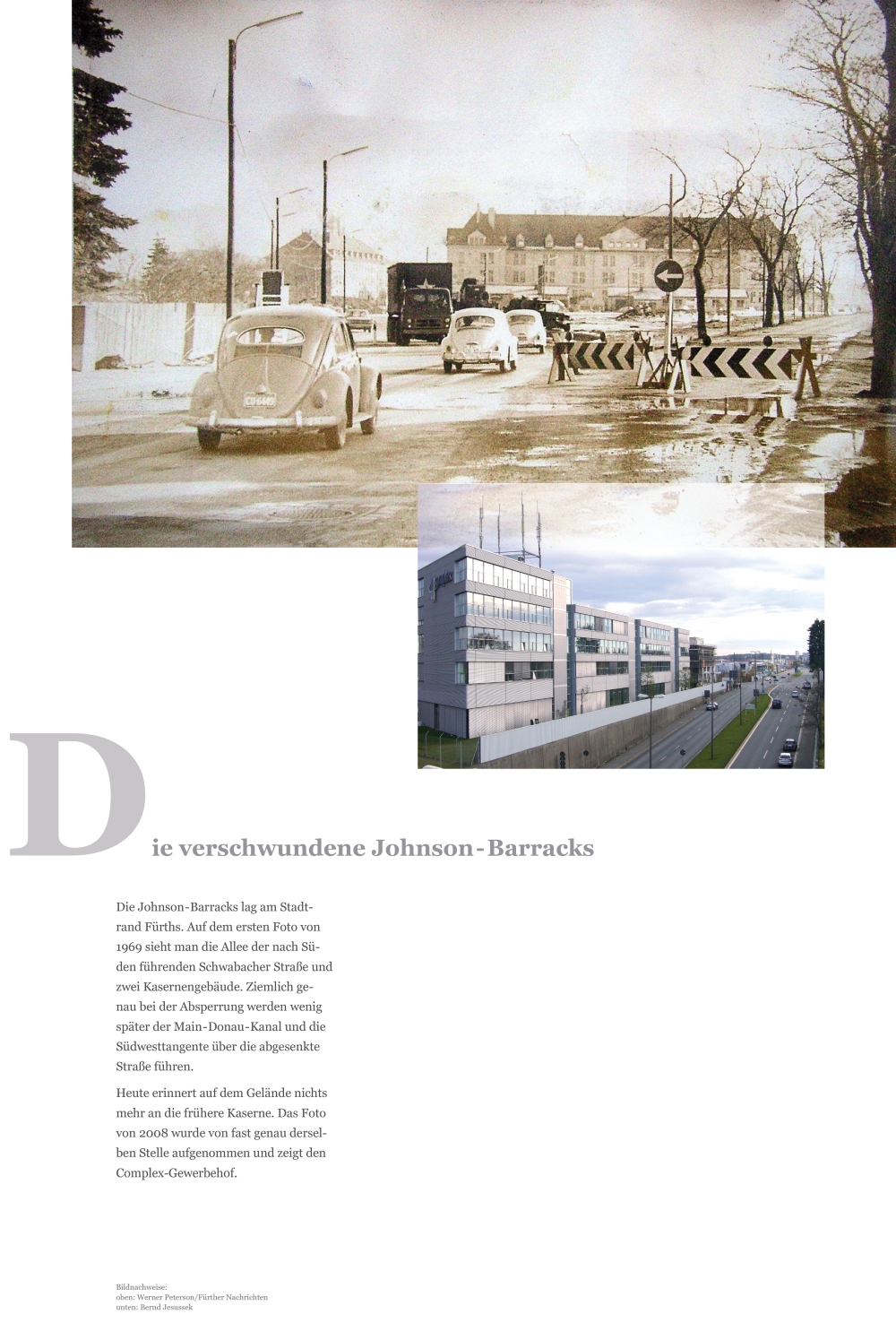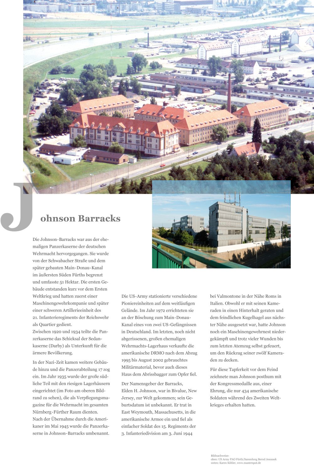 The Johnson Barracks emerged from the former tank barracks of the German Wehrmacht. It was bordered by Schwabacher Strasse and the Main-Danube Canal in the extreme south of Fuerth and covered 51 hectares. The first buildings had been built shortly before the First World War and had served first as quarters for a machine gun company and later for a heavy artillery unit of the 21st Infantry Regiment of the Reichswehr. Between 1920 and 1934, the tank barracks shared the fate of the Sedan barracks (Darby) as accommodation for the poorer population. In the Nazi era, more buildings were added and Anti Tank Regiment 17 moved in. In 1935, the large southern part was set up with the huge warehouses (shown in the photo at the top of the picture), which served as food stores for the Wehrmacht in the entire Nuremberg-Fuerth area. After it was taken over by the Americans in May 1945, the tank barracks were renamed Johnson Barracks. The US Army stationed various engineer units on the extensive area. In 1972 they built one of two US prisons in Germany on the embankment of the Main-Danube Canal. In the last, not yet demolished, large former Wehrmacht warehouse, the American DRMO sold used military equipment after the withdrawal from 1995 until August 2002, before this house also fell victim to the demolition excavator. The namesake of the Barracks, Elden H. Johnson, was born in Bivalue, New Jersey, and his date of birth is unknown. He enlisted in the American Army in East Weymouth, Massachusetts, and died as a simple soldier in the 15th Regiment of the 3rd Infantry Division on June 3, 1944 at Valmontone near Rome in Italy. Although he and his comrades were ambushed and exposed to the hostile hail of bullets at close range, Johnson had fought down a machine gun nest and, despite many wounds, fired himself to the last breath to cover the retreat of his twelve comrades. For his bravery in the face of the enemy, Johnson was posthumously awarded the Congressional Medal, an honor that only 434 American soldiers had received during World War II. |