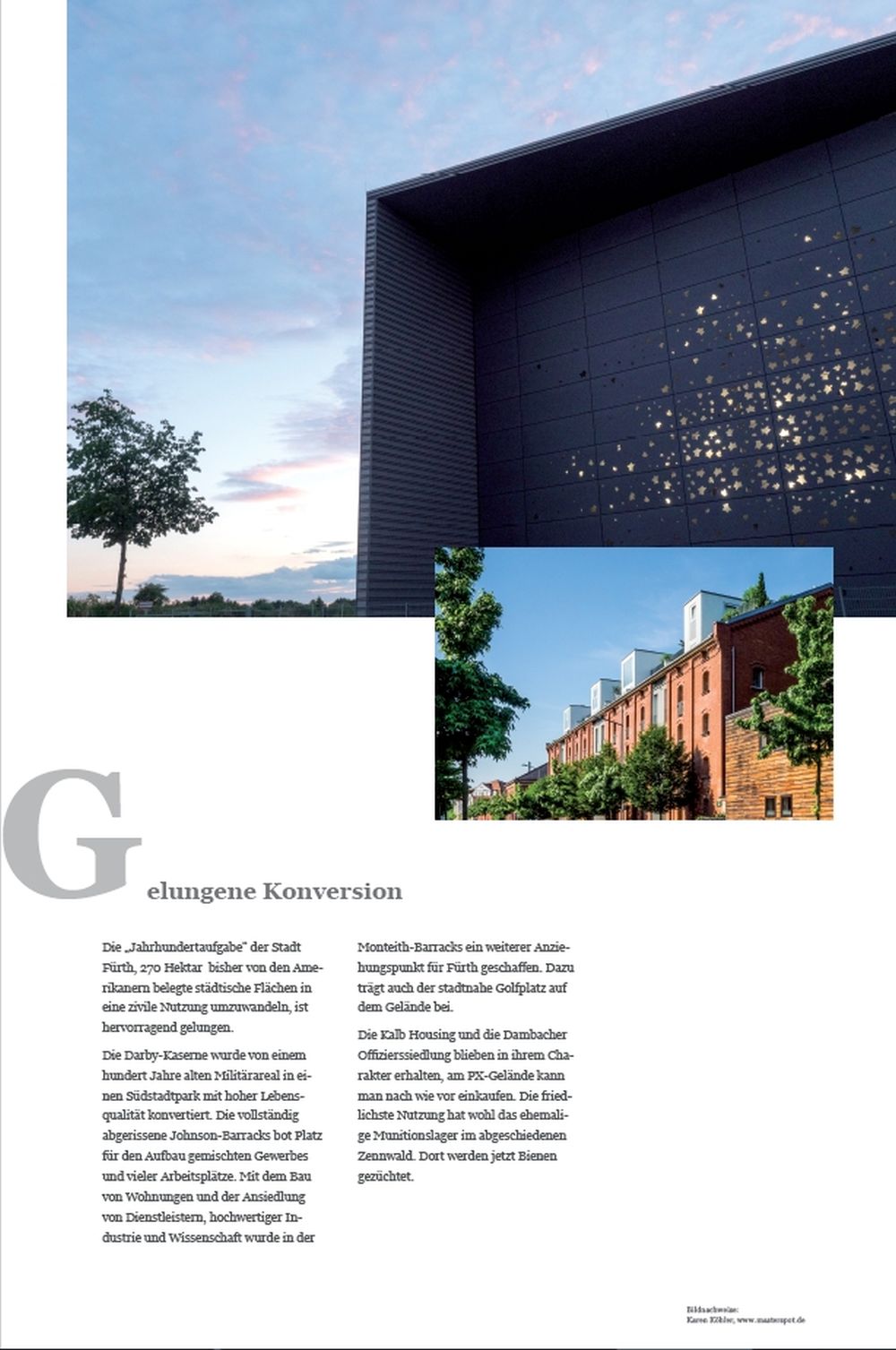 The “task of the century” of the city of Fuerth, to convert 270 hectares of urban space occupied by the Americans into civil use, has been an excellent success. The Darby Kaserne was converted from a hundred year old military area into a south city park with a high quality of life. The completely demolished Johnson Barracks provided space for the construction of mixed businesses and many jobs. With the construction of apartments and the settlement of service providers, high-quality industry and science, another point of attraction for Fuerth was created in the Monteith-Barracks. The golf course near the city also contributes to this. The character of the Kalb Housing and the Dambach officers' settlement was retained, and you can still shop on the PX site. The most peaceful use is probably the former ammunition store in the secluded Zennwald. Bees are now bred there. |