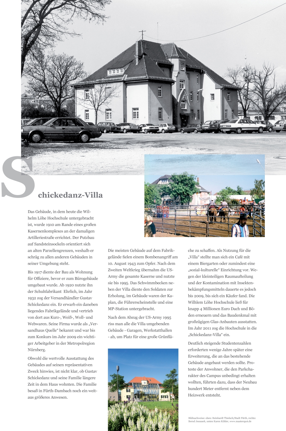 The building, which today houses the Wilhelm Löhe University, was built in 1910 on the edge of a large barracks complex on what was then Artilleriestrasse. The plastered building on sandstone bases is based on old parcel boundaries, which is why it is at an angle to all other buildings in its vicinity. Until 1917 the building served as an apartment for officers before it was converted into an office building. The shoe manufacturer Ehrlich started using it in 1920, and the mail order company Gustav Schickedanz moved in in 1932. He acquired an adjacent factory site and from there sold short, white, wool and woven goods. His company became known as "Versandhaus Quelle" and was an important employer in the Nuremberg metropolitan region until bankruptcy in 2009. Although the valuable furnishings of the building indicated its representative purpose, it is not clear whether Gustav Schickedanz and his family lived in the house for a long time. The family owned a much larger property in Fürth-Dambach. Most of the buildings on the factory site were bombed on August 10, 1943. After the Second World War, the US Army took over the entire barracks and used them until 1995. The swimming pool next to the villa was used by the soldiers for recreation; the building housed the chaplain, the driver's license office and an MP station. After the US Army withdrew in 1995, all the buildings surrounding the villa - garages, workshops - were torn down to make room for a large green area. A café with a beer garden or at least a “socio-cultural” facility was imagined as a use for the “villa”. However, due to the small-scale room layout and the contamination with insect control agents, it was not until 2009 that a buyer was found. The Wilhlem Löhe University had the roof and floors renewed for almost 4 million euros and the monument equipped with generous glass extensions. In 2011 the university moved into the “Schickedanz Villa”. Significantly increasing student numbers required an extension a few years later, which was to be added to the existing building. Protests by residents, who absolutely wanted to preserve the park-like character of the campus, led to the new building being built a hundred meters away next to the heating plant. |