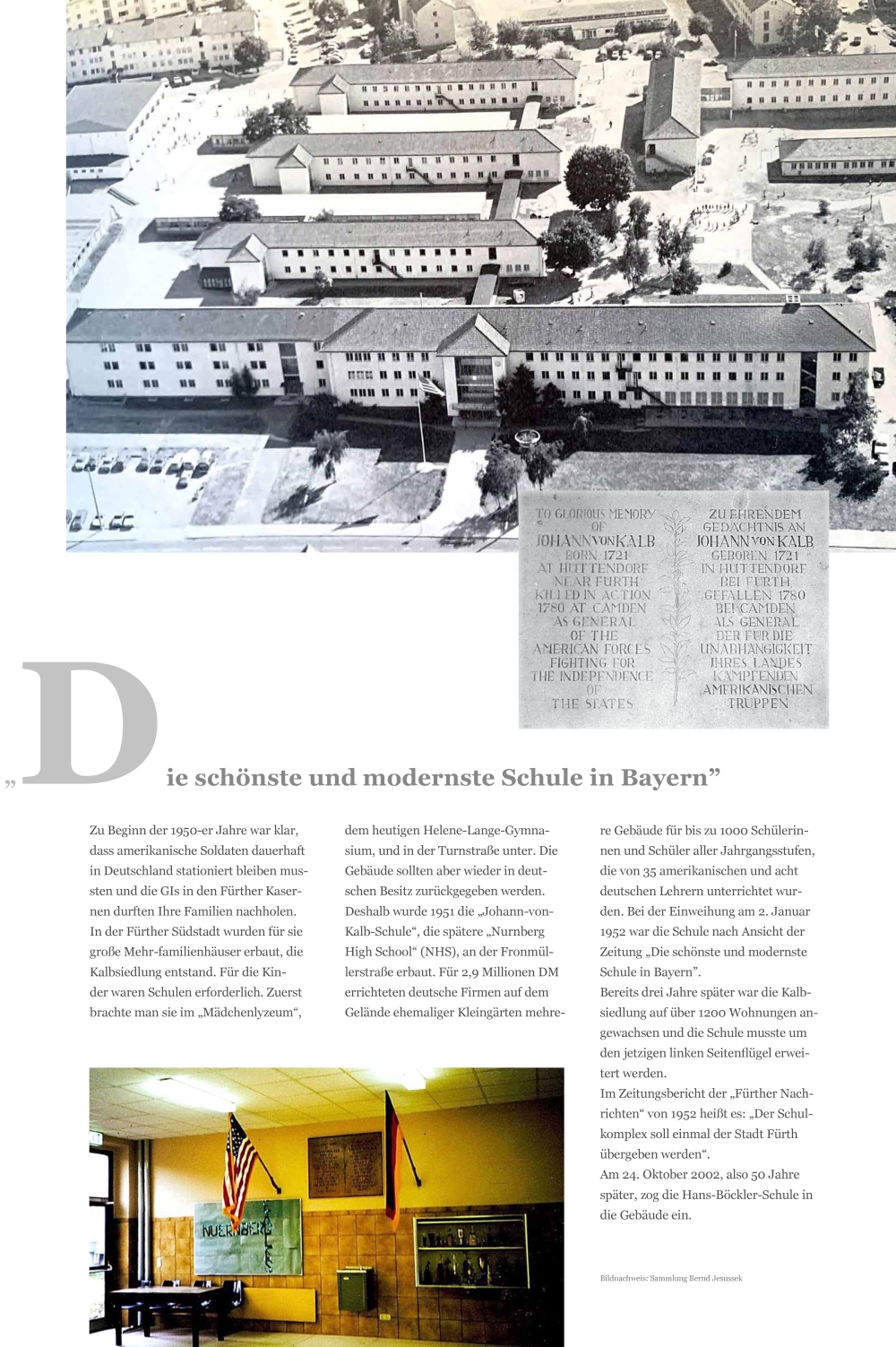 At the beginning of the 1950s it was clear that American soldiers had to remain permanently stationed in Germany and the GIs in the Fürth barracks were allowed to bring their families to their home countries. Large apartment buildings were built for them in the southern part of Fuerth, and the Kalb Housing was built. Schools were required for the children. At first she was placed in the “girls' lyceum”, today's Helene-Lange-Gymnasium, and in Turnstrasse. However, the buildings should be returned to German ownership. Therefore, in 1951 the "Johann von Kalb School", later the "Nurnberg High School" (NHS), was built on Fronmüllerstrasse. For 2.9 million DM, German companies built several buildings on the site of the former allotment gardens for up to 1000 students of all grades, who were taught by 35 American and eight German teachers. When the school was inaugurated on January 2, 1952, the newspaper said it was “the most beautiful and most modern school in Bavaria”. Just three years later, the Kalbsiedlung had grown to over 1200 apartments and the school had to be expanded to include the current left wing. In the newspaper report of the “Fürther Nachrichten” from 1952 it says: “The school complex is to be handed over to the city of Fürth”. On October 24, 2002, 50 years later, the Hans Böckler School moved into the building. |