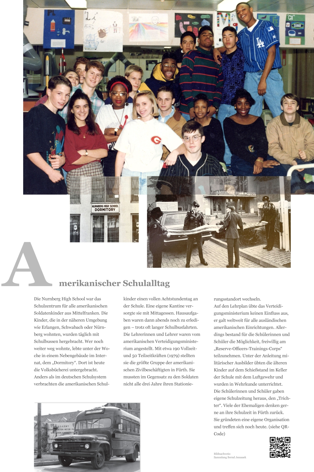 The panels on the history of the Americans in Fuerth were created as part of the Fürth city anniversary for “City Development 1818-2018” and could be seen in an exhibition in the public library. Now they are in the Hans Böckler School, the former Nurnberg High School. This is the only building whose use has not changed since the US era. The boards are intended to inform young people about the American occupiers, neighbors and friends and to keep the memory of the people of Fuerth alive. Bernd Jesussek, October 2020 |