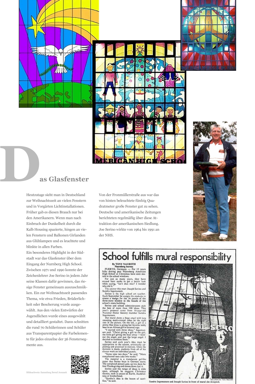 Nowadays in Germany at Christmas time you can see light installations on many windows and in front gardens. In the past it used to be a custom only among Americans. If you walked through the Kalb Housing after dark, garlands of incandescent lamps hung on many windows and balconies and it shone and blinked in all colors. A special highlight in Südstadt was the glass window above the entrance to Nurnberg High School. Every year between 1971 and 1990 the drawing teacher Joe Serino was able to convince his classes to decorate the huge window together. A theme suitable for the Christmas season, such as peace, brotherhood or giving presents was selected. From the many drafts of the young people, one was selected and designed in detail. Then the 70 or so students cut out the color elements for each of the 36 window segments from tracing paper. The backlit, fifty-square-meter window was easy to see from Fronmüllerstrasse. German and American newspapers reported regularly about this attraction of the American settlement. Joe Serino worked at the NHS from 1964 to 1991. |