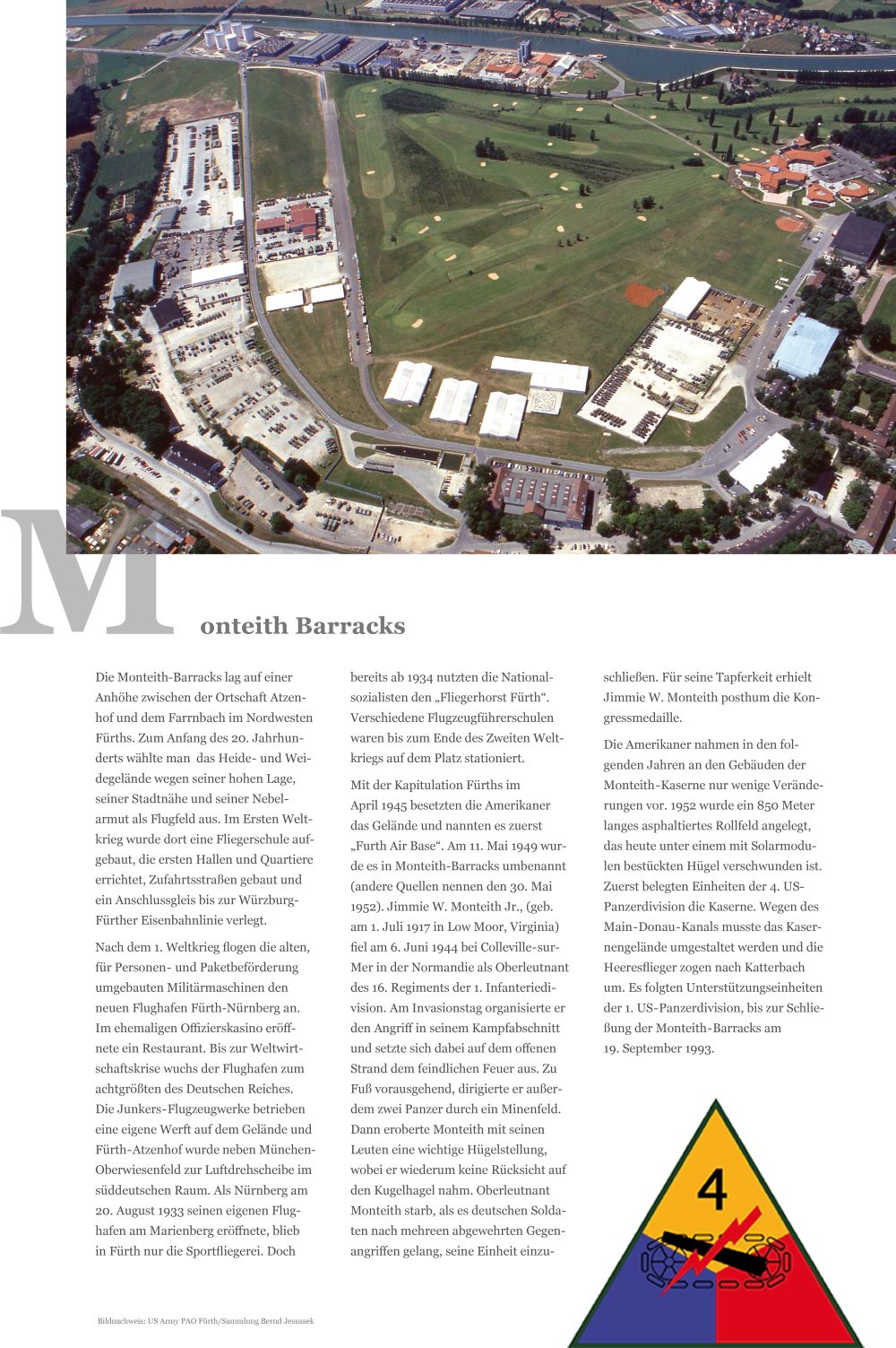 The Monteith Barracks was located on a hill between the village of Atzenhof and the Farrnbach in the north-west of Fuerth. At the beginning of the 20th century, the heather and pasture area was chosen as an airfield because of its high location, its proximity to the city and its lack of fog. During the First World War, a flying school was built there, the first halls and quarters were built, access roads were built and a siding was laid to the Wuerzburg-Fuerth railway line. After the First World War, the old military planes that had been converted for passenger and parcel transport flew to the new Fuerth-Nuremberg airport. A restaurant opened in the former officers' mess. Up until the Great Depression, the airport grew to become the eighth largest in the German Empire. Junkers-Flugzeugwerke operated its own aircraft yard on the site and Fuerth-Atzenhof became an air hub in southern Germany alongside Munich-Oberwiesenfeld. When Nuremberg opened its own airport at Marienberg on August 20, 1933, only sports aviation remained in Fuerth. But as early as 1934, the National Socialists were using the "Fuerth Air Base" for the Luftwaffe. Various pilot schools were stationed on the field until the end of World War II. After Fuerth surrendered in April 1945, the Americans occupied the site and first called it "Furth Air Base". On May 11, 1949, it was renamed Monteith-Barracks (other sources cite May 30, 1952). Jimmie W. Monteith Jr., (born July 1, 1917 in Low Moor, Virginia) died on June 6, 1944 near Colleville-sur-Mer in Normandy as a lieutenant in the 16th regiment of the 1st Infantry Division . On the day of the invasion, he organized the attack in his combat section and exposed himself to enemy fire on the open beach. Walking ahead, he also directed two tanks through a minefield. Then Monteith and his people conquered an important hilltop position, again not paying attention to the hail of bullets. First lieutenant Monteith died when German soldiers succeeded in encircling his unit after repelling several counter-attacks. Jimmie W. Monteith was posthumously awarded the Congress Medal for his bravery. In the years that followed, the Americans made only a few changes to the buildings of Monteith Barracks. In 1952, an 850 meter long asphalt runway was laid out, which has now disappeared under a hill equipped with solar modules. First, units of the 4th US Armored Division occupied the barracks. Because of the Main-Danube Canal, the barracks area had to be redesigned and the army pilots moved to Katterbach. Support units of the 1st US Armored Division followed until the Monteith Barracks were closed on September 19, 1993. |
